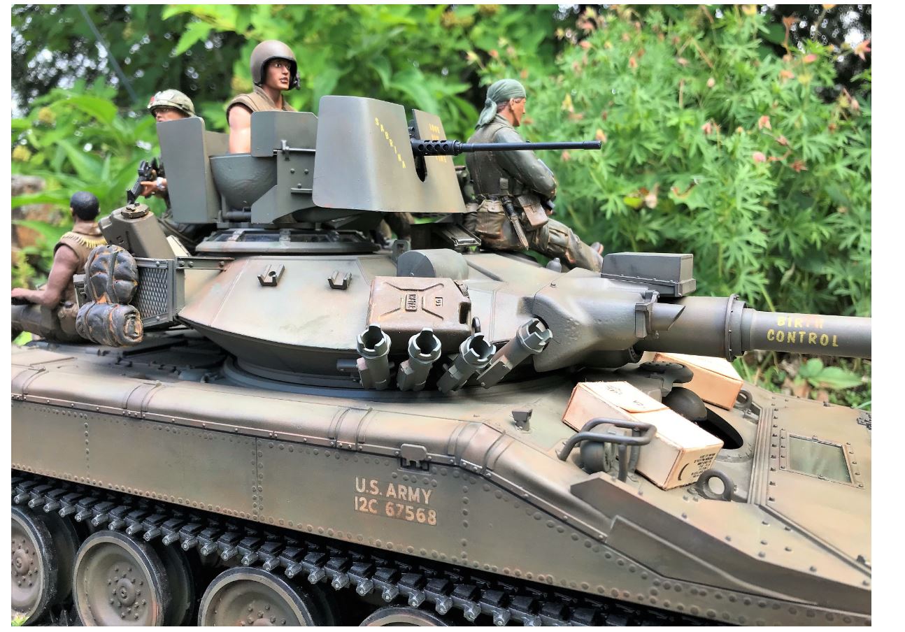 For the drive through a thick jungle trail, the commander invited 4 soldiers of the M-113 platoon to ride on his Sheridan. This has the benefits of providing extra eyes and firepower for the tank, and freeing space on the crowded M-113.