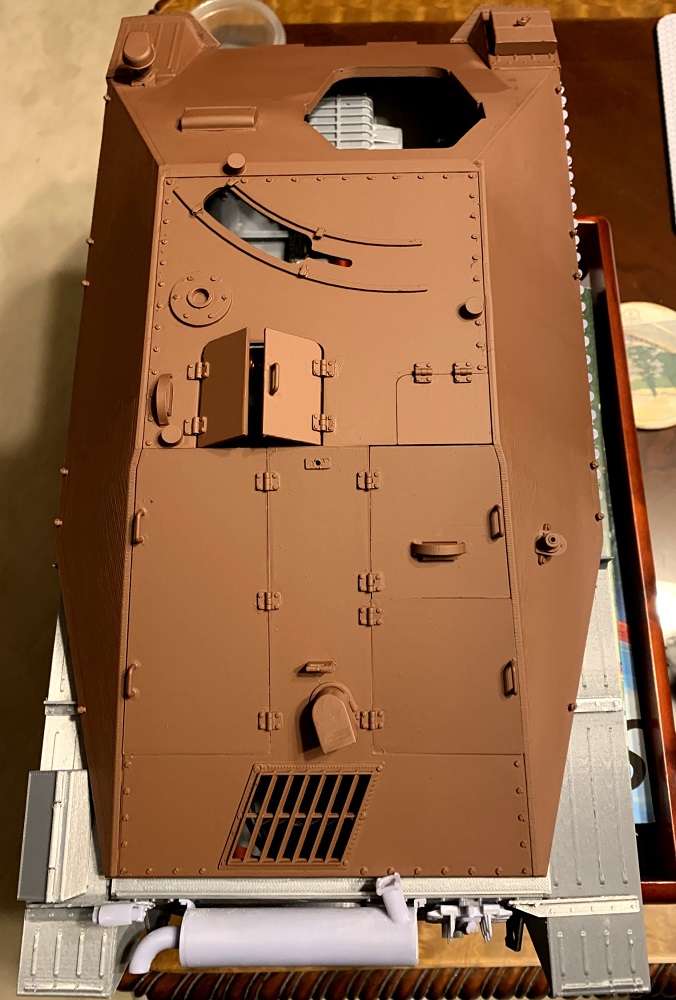 I primered up the upper hull. With a consistent coat on it it doesn't look half bad. I've no talent for painting, so now comes the hard part for me!