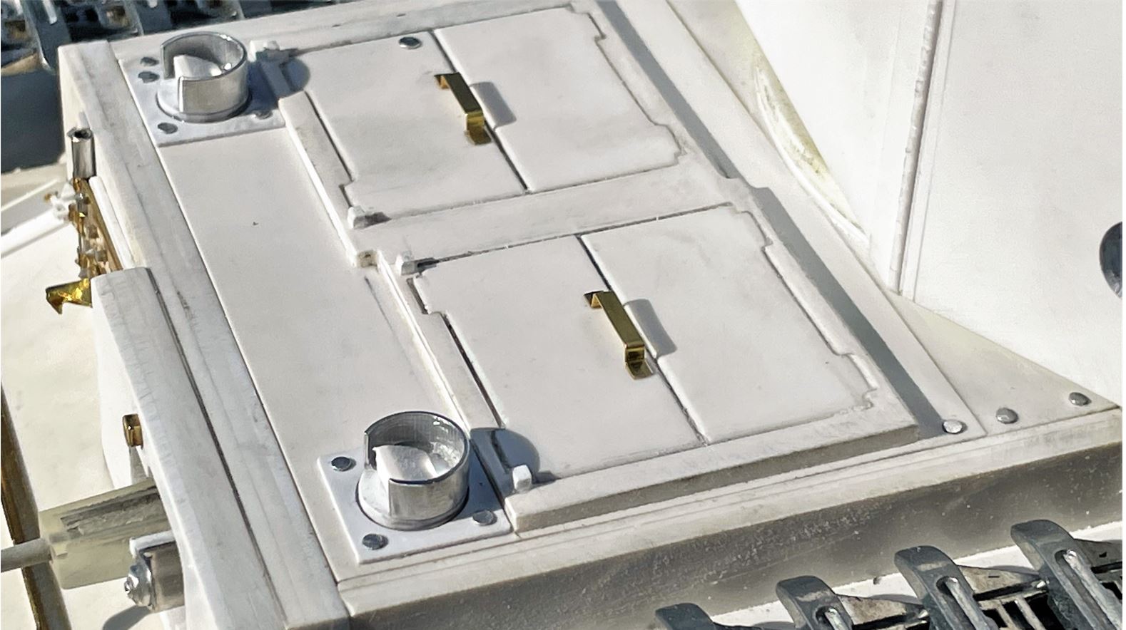 View of a surviving Churchill Mk III driver's rotating periscope with the rounded armor. Notice the base plate and the flat head rivets seen across the deck, seen on AFV Club model as well with precise locations.