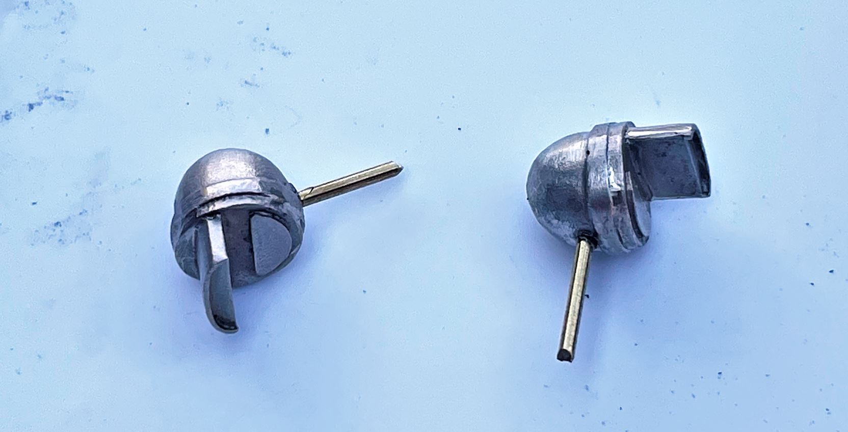 The rivets are aluminum Knupfer 1.2mm x 4mm with the rounded head flattened with a nail file as shown with red pointer.