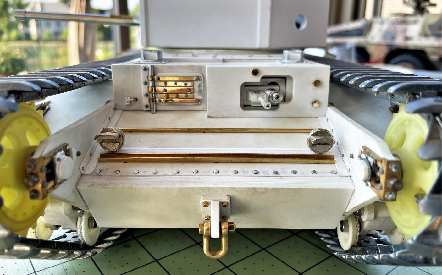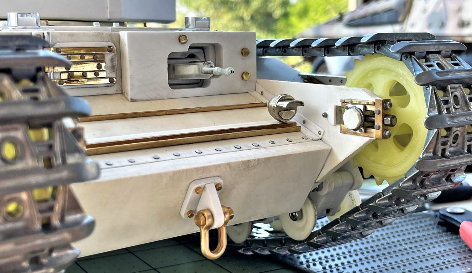 Frontal tow hook and glacis rivets installed. The hook used is an Aber Panther hook. A bit long but looking good with a brass M2.5 bolt and nut.