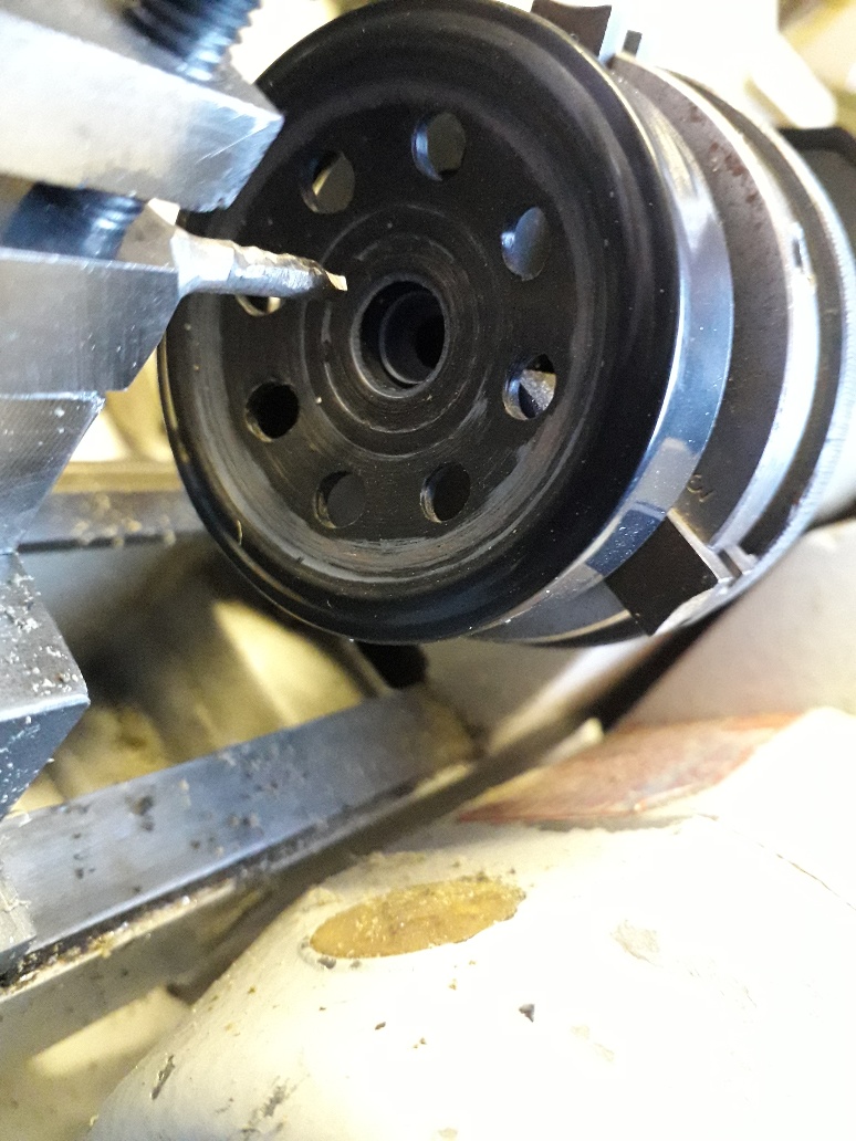 Now here is a bit of an issue as the internal diameter of the "bolt hole " in the wheel is tapered getting smaller the further down you go making any cap fitting difficult, so i popped each wheel into the lathe and bored out a concentric hole about 3mm deep, this will allow my turned caps to fit in and hopefully stay put.
