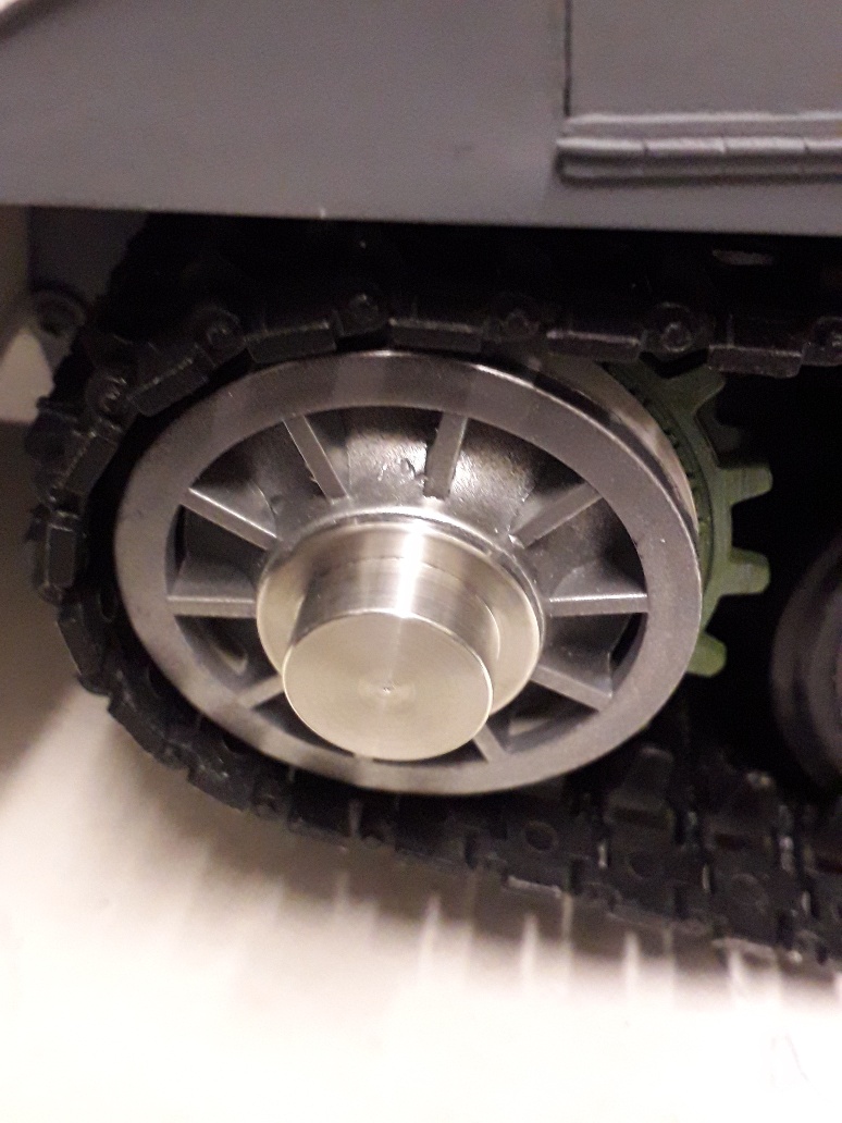 I removed some material off the wheel boss, turned down the shoulders of the wheel bolts and removed some material from the axle caps length, this moved the wheels closer to the hull so i had to extend the wheels axle where it bolts onto the suspension arm to get the inner road wheels back to the correct spacing to fit inside the tracks for correct alignment.