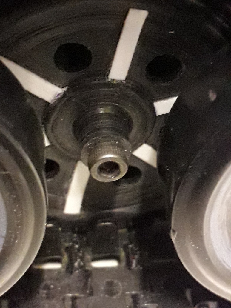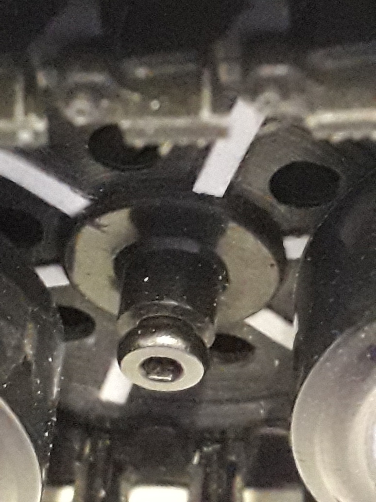 Turned my attention to the inner wheels, i used the standard wheel attachment screws / bolts to fit everything together to see if it all worked which it does very well, however the standard bolts are too long by about 4mm, (see pic) the screw end of the bolt is 2.89mm wide with a type of self tapping thread to go into the plastic suspension arm, these are not available to buy or realistically make shorter so i used some 3mm x 35mm cap / machine screws i had in stock and tapped out the hole in the suspension arm 3mm so they would screw into it correctly, the original bolts were held in place when the shoulder of the bolt tightened up against the suspension arm.