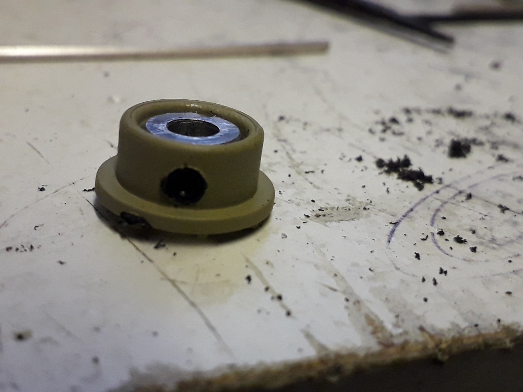 The hole in the wheel is 4mm diameter so i bushed up the hole with some 4mm brass tube by 3mm internal diameter which allows the new bolt to pass through, i made this bush slightly longer than the wheel and its axle to allow the bolt to tighten up against this brass bush and the suspension arm locking it in place as per the standard original fitment, there is enough clearance when tightened to allow the wheel to spin freely on the brass bush, and now the 4mm over length of the original bolt is removed, now i can sort an axle cap.