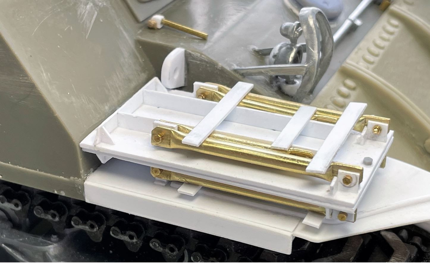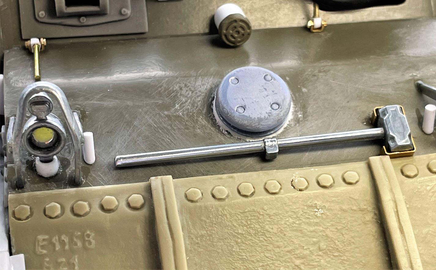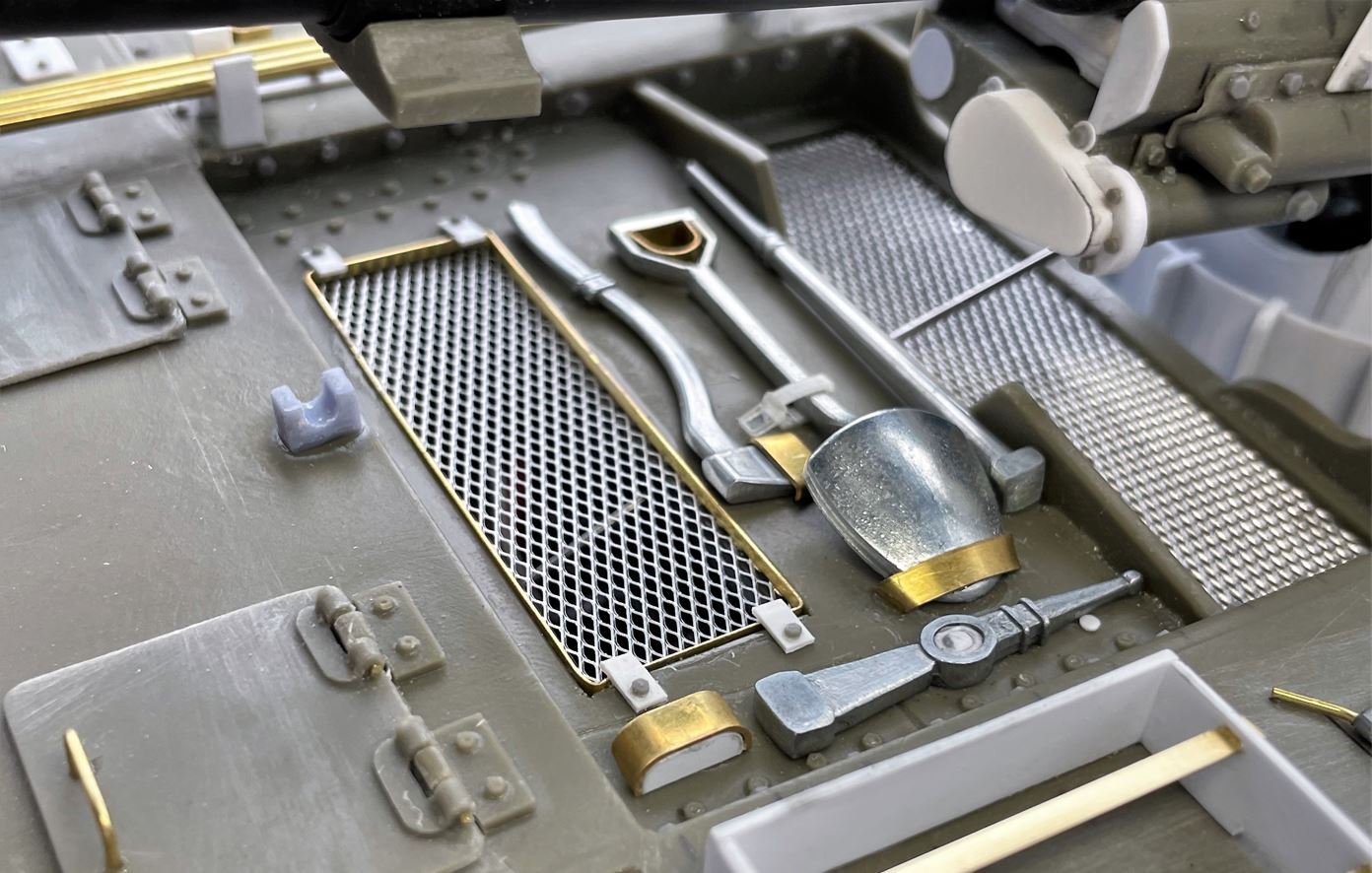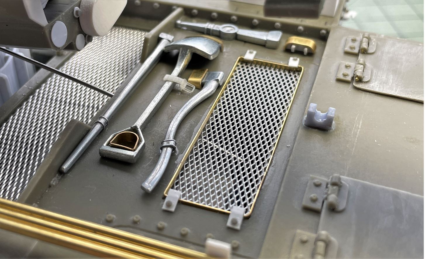 Mato metal Sherman tools were modified and installed as per reference. The grill was given a brass frame, with locking brackets seen in pictures.