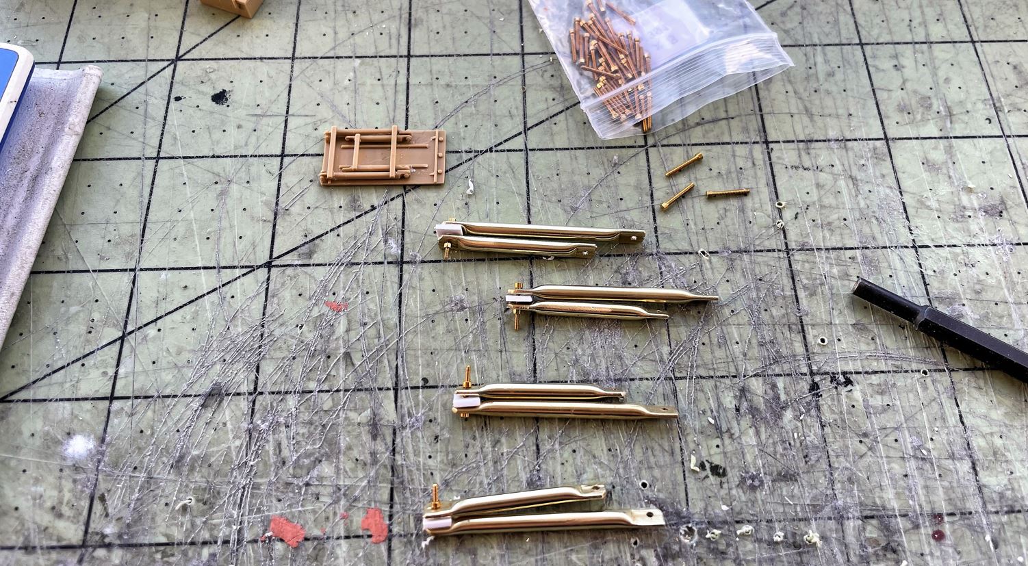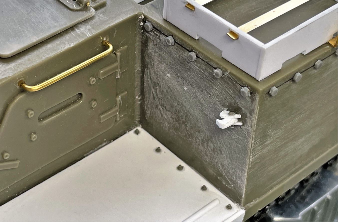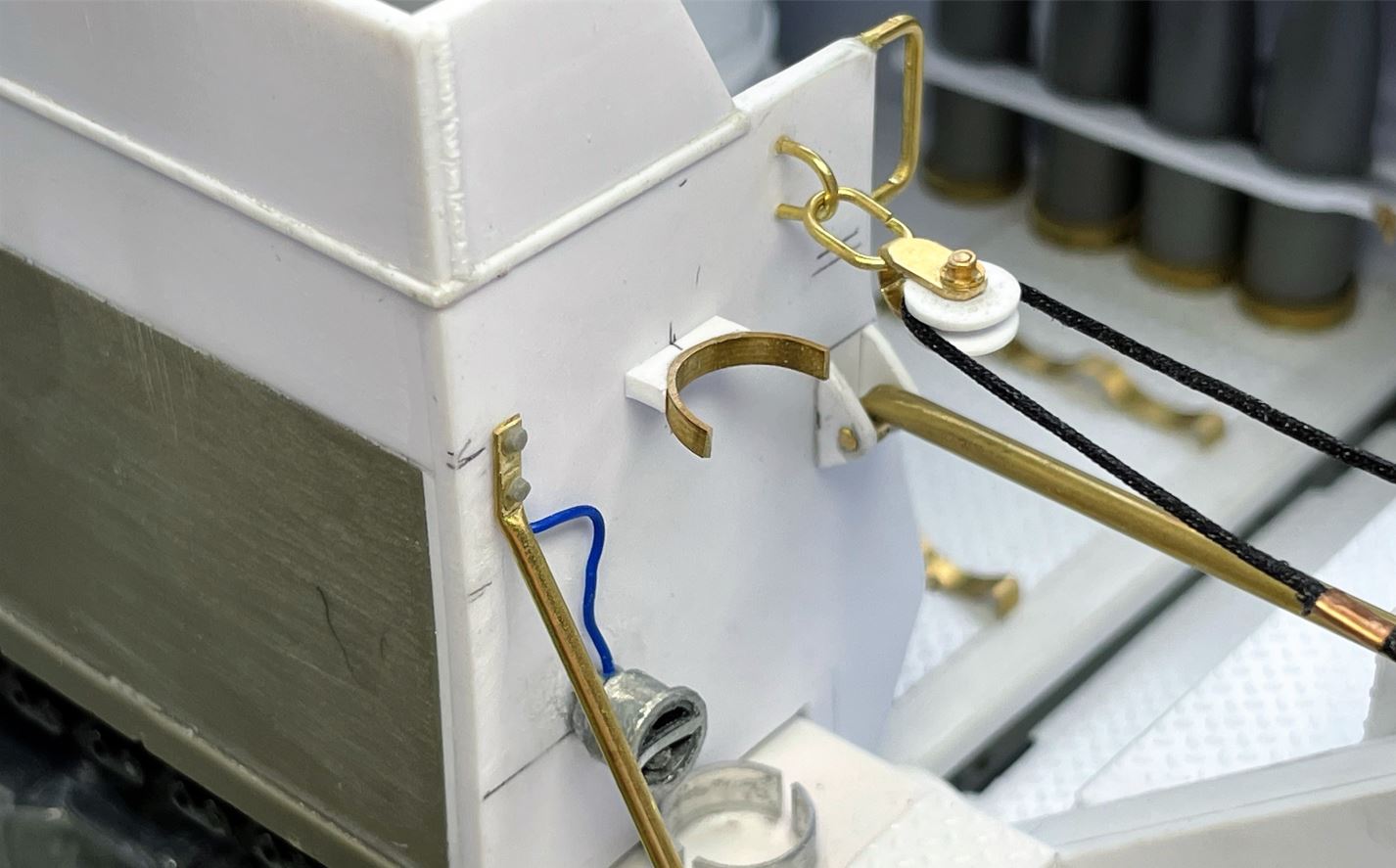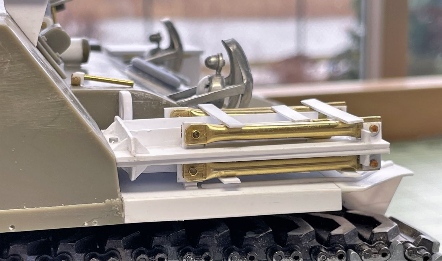 Mato metal Sherman tools were modified and installed as per reference. The grill was given a brass frame, with locking brackets seen in pictures.