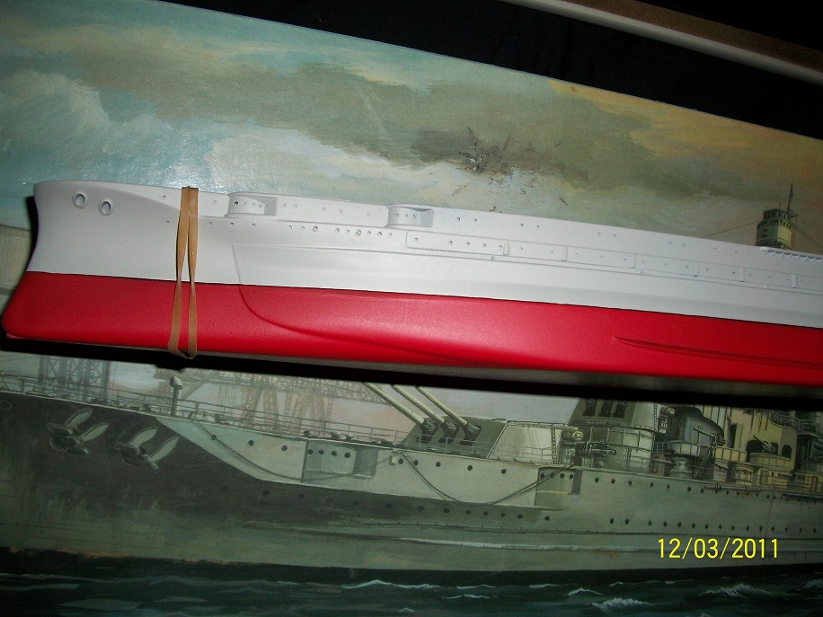 I have done a little more work on the model and couldn't wait any longer and had to give the hull a quick blast of primer. The other parts are being worked on and you've done well with your e-bay purchase and funny how some ship kit manufacturers choose unbelievable colours of their plastic. Green ideal for grey hull with red anti foul. Looking at the colour scheme you have in mind for the ship two things strike me. How dark the grey is and what a superb contrast with the red. I am building a Hood at the moment and have the White Ensign Models colour coat AP507a correct shade for Hood, but when applied it looks ever so dark compared to the colour photos and film footage of the ship.