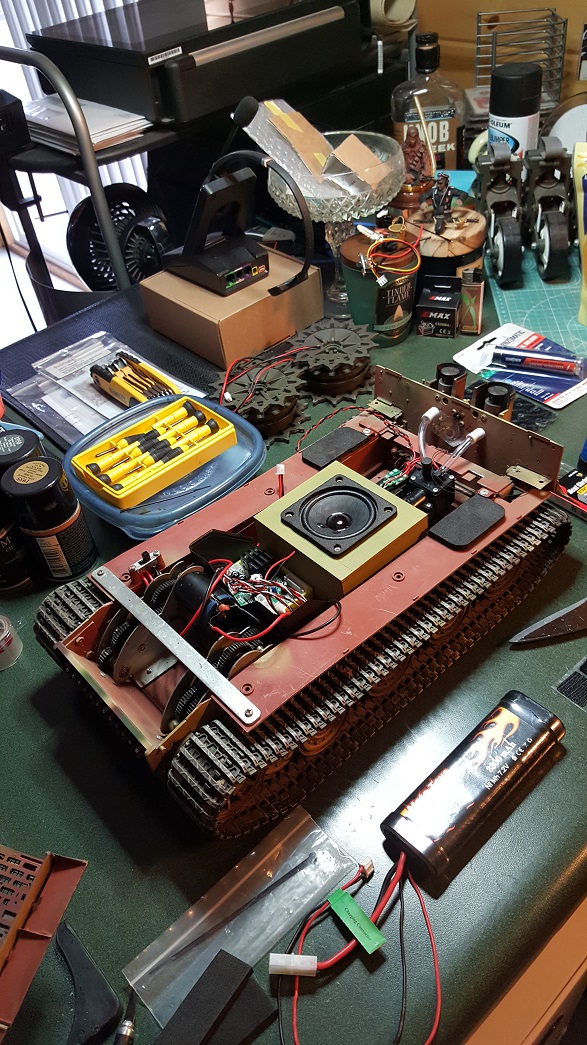 Coming out of a medical gig that has been an extreme mental PITA, I am finally feeling up to working on tanks again. Back to Jacks Tiger, tonight I built the combo smoker and sound switch\pot housing. I took the time to wire almost everything up, ( solder and attach ) and only have to figure out how to power the convoy light using the MFU, ( not the 8 pin in the upper hull ). Then, it is just awaiting the arrival of the new Radio and Rx. Max is on the job so this Tiger will be rolling here soon.