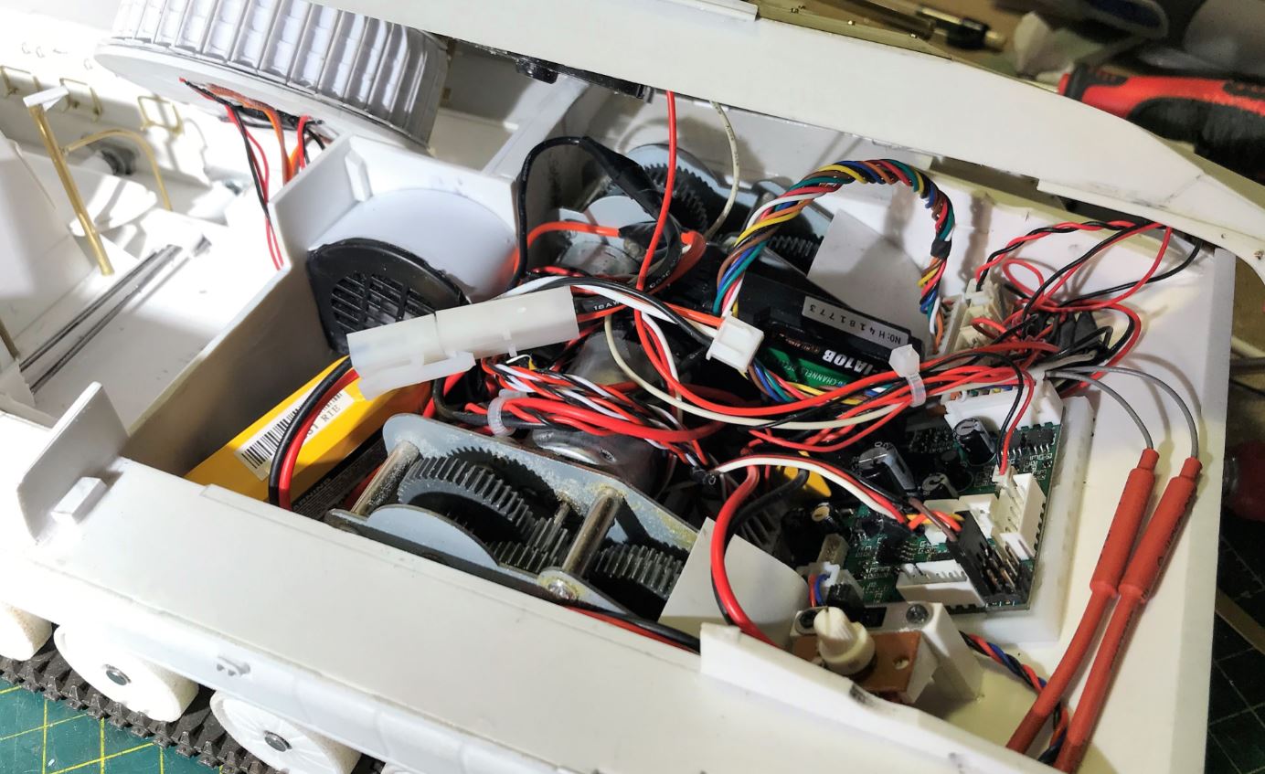 Here are views of under the hood. This is quite basic, with a Clark T-34 TK-22 control board, Heng Long speaker in a smaller custom mount, switch, volume control, Flysky receiver and Zippy 800 battery, but there is room for a Zippy 1000.
