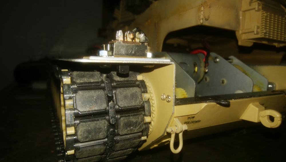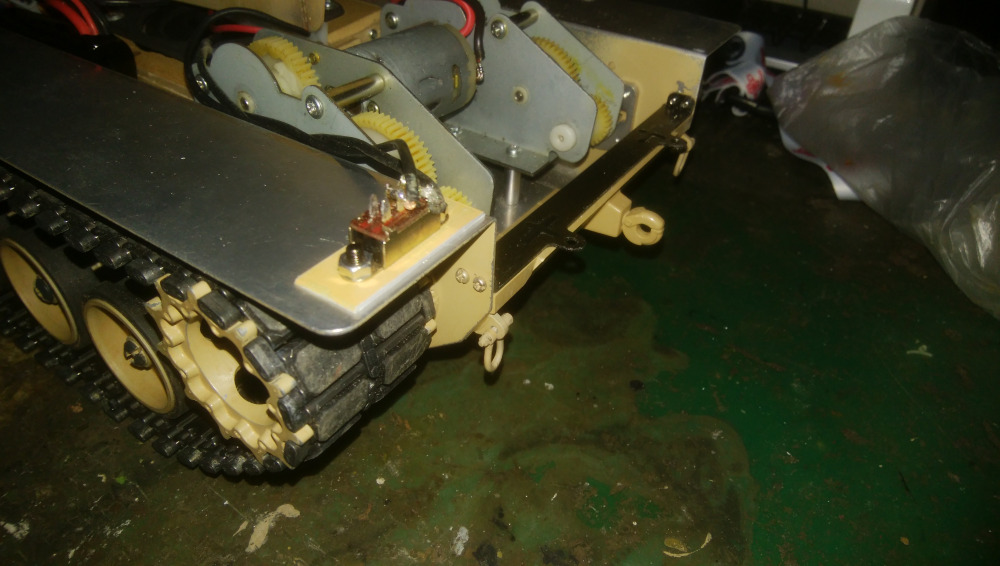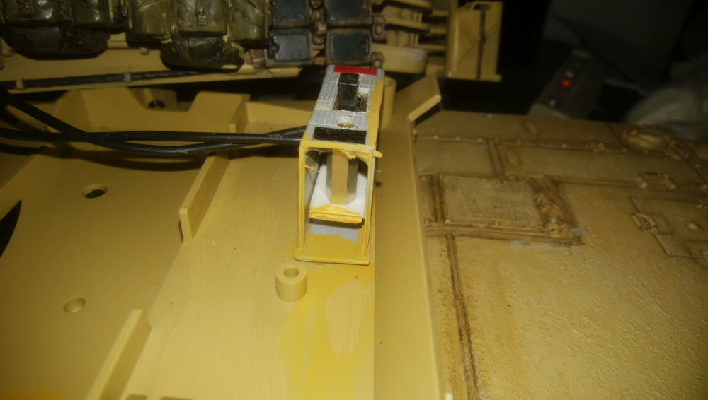 When I installed the main switch on the rear upper part of the rear drive sprocket wheel, it was hidden behind the side skirt and the switch was invisible, but within easy reach of my fingers.? I made a rectangular hole for the switch in the relevant part of the under hull and fixed it with a screw. The switch is completely invisible when the upper hull is installed. But my fingers can easily reach the switch.