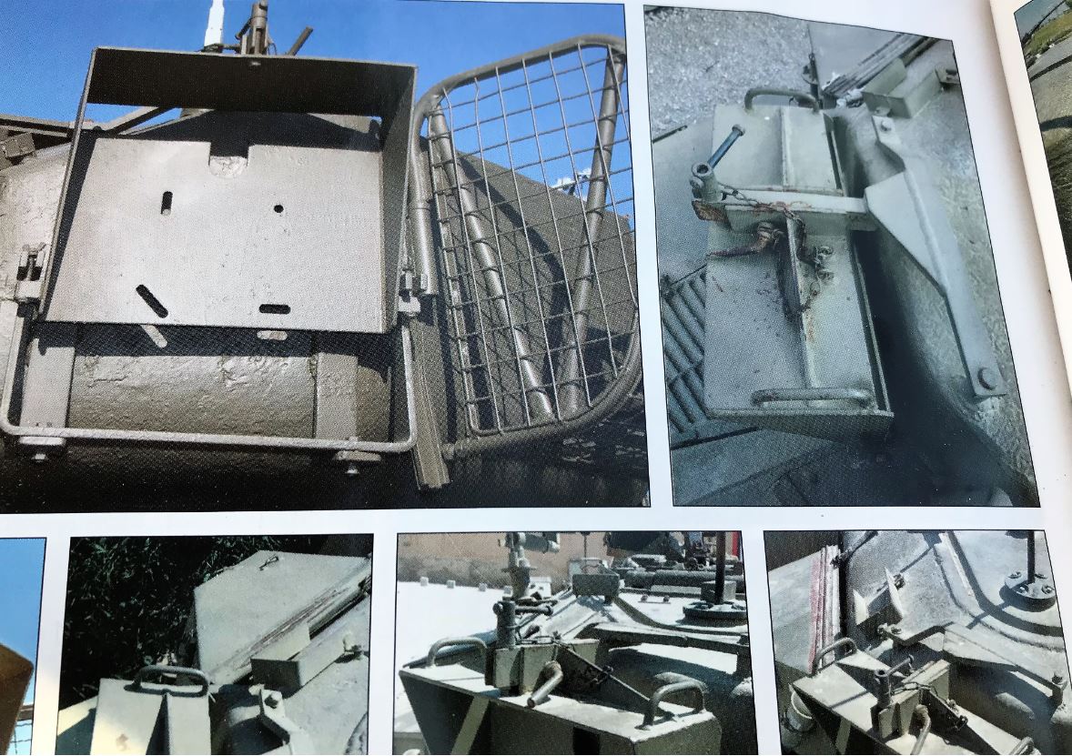 This post is for the searchlight mount at the rear of the turret. I have not found any picture of the actual searchlight, how it looks like or how the mount is deployed when the searchlight is installed. However, the book "Centurion of the IDF vol 7" has a good page of close up pictures of the folded mount.