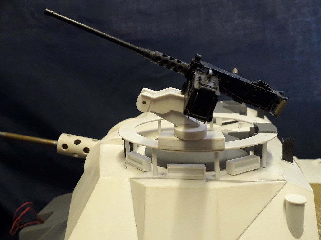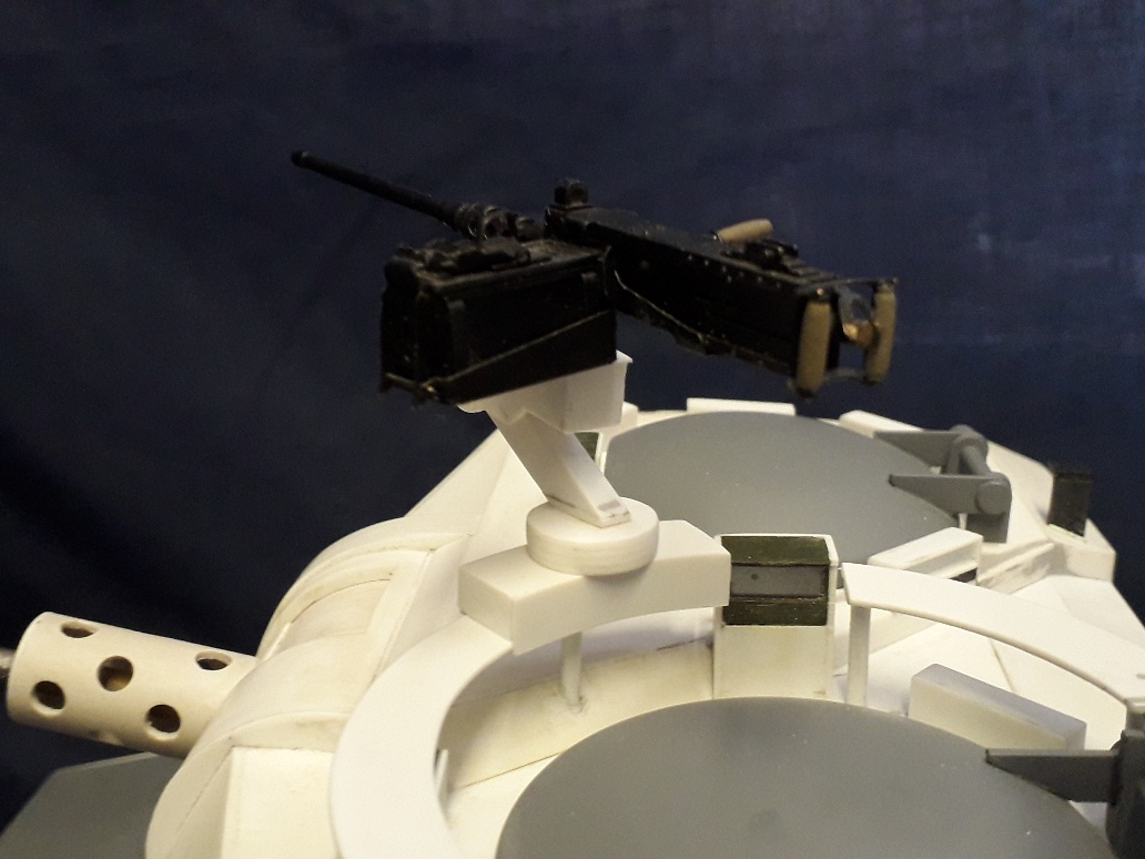Having a break from spraying my FV432/30 Bull dog so decided to make the multi position .50 cal gun mount, it slides around the gunners hatch on its ring mount, also moves up and down like a scissor jack and also pivots on the ring mount plus the .50 cal itself can svivel on the upper mounting.