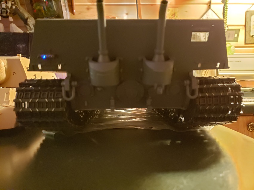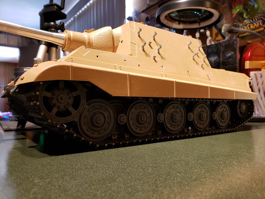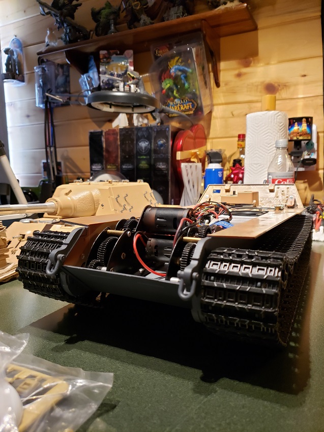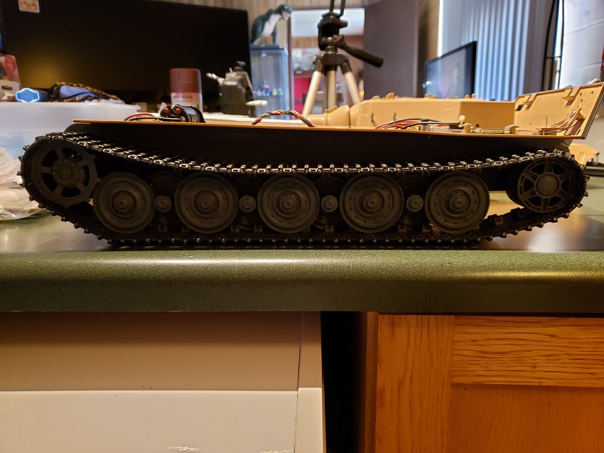 Afternoon all! Jimster, truer words neer' spoken! Even after 41 yrs here, it can still surprise me. Max! Thank for looking in again! I've lived in the small ( and cozy ) space here for 5 yrs now. Even tho' a bigger space is in the offing, I think that I will still do my old guy Hobbies here. Gillaspy, Thanks, Doc! The fun continues! The vistas I owe to the mountain ranges that surround us here in the Valley. Eric! A very truthful saying. It is coming along, my friend. Tonight I put the road wheels and idlers back on the Lower and remounted the tracks. I was pleased that I could now adjust the idlers and track sway with the adjusters after the circlip fix and they stayed where I left them at. A small fix but important when your tank weighs as much as this monster.