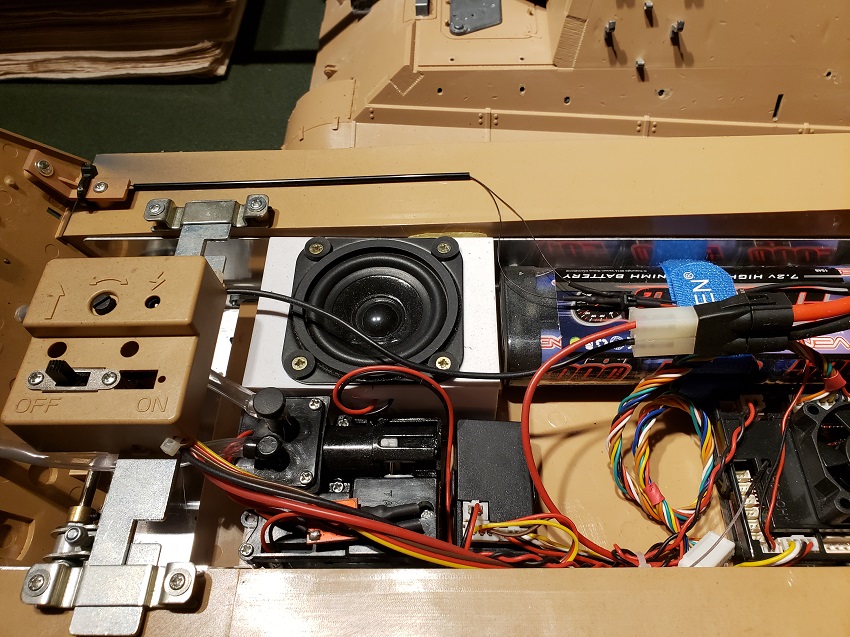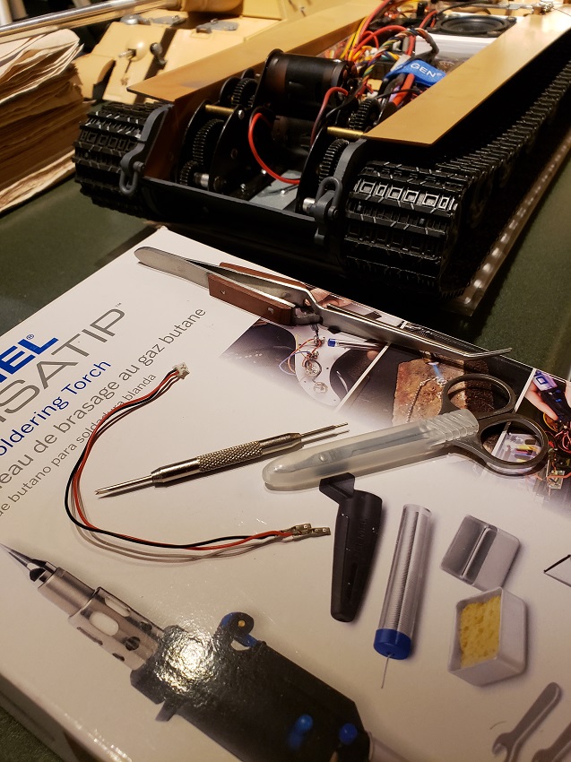 I picked up tools over the last couple of days to do the last bit ( fingers crossed ) of electrical work on this Build. The brass convoy light is of the type where only one of the lens illuminates. Great for looks and requires no dimming down. Two power ports are available on the Taigen series 3 board. There is the standard 'rear lamp back up' and on these new boards with their receiver option, there is the two pin circuit close mini port which is always powered. I have never liked the standard option since there is no Light unless the tank is in reverse. To use the two pin mini port, a cable has to be soldered together to work with the coated wire of this type of light. The results are worth it.