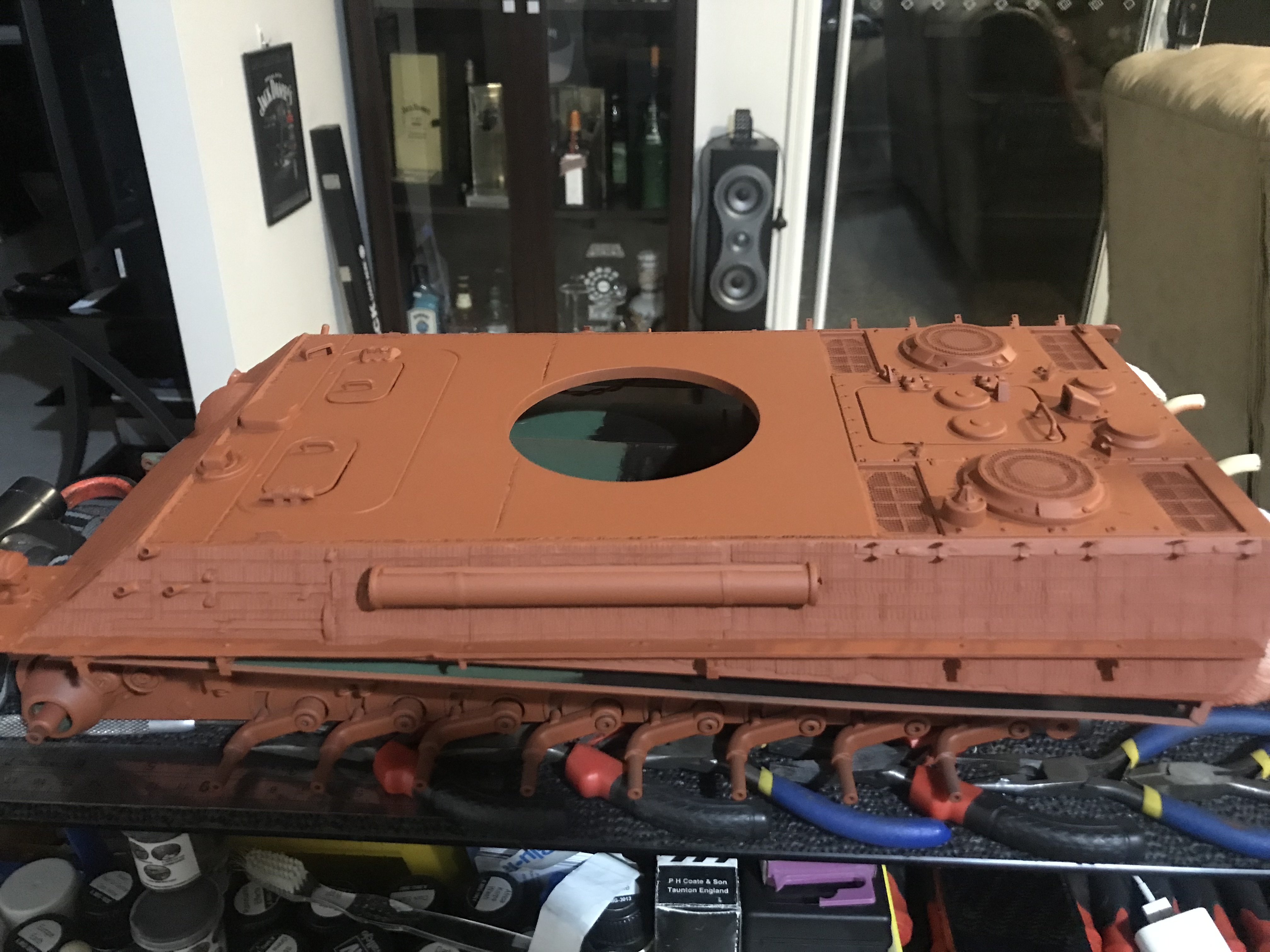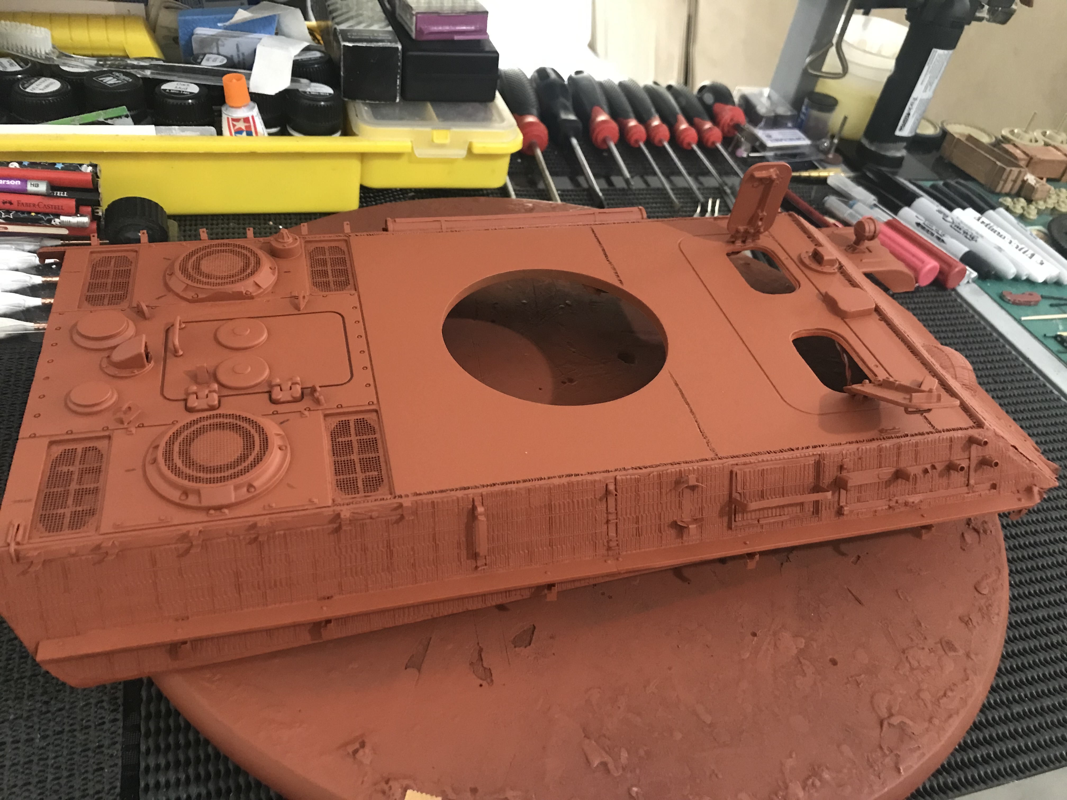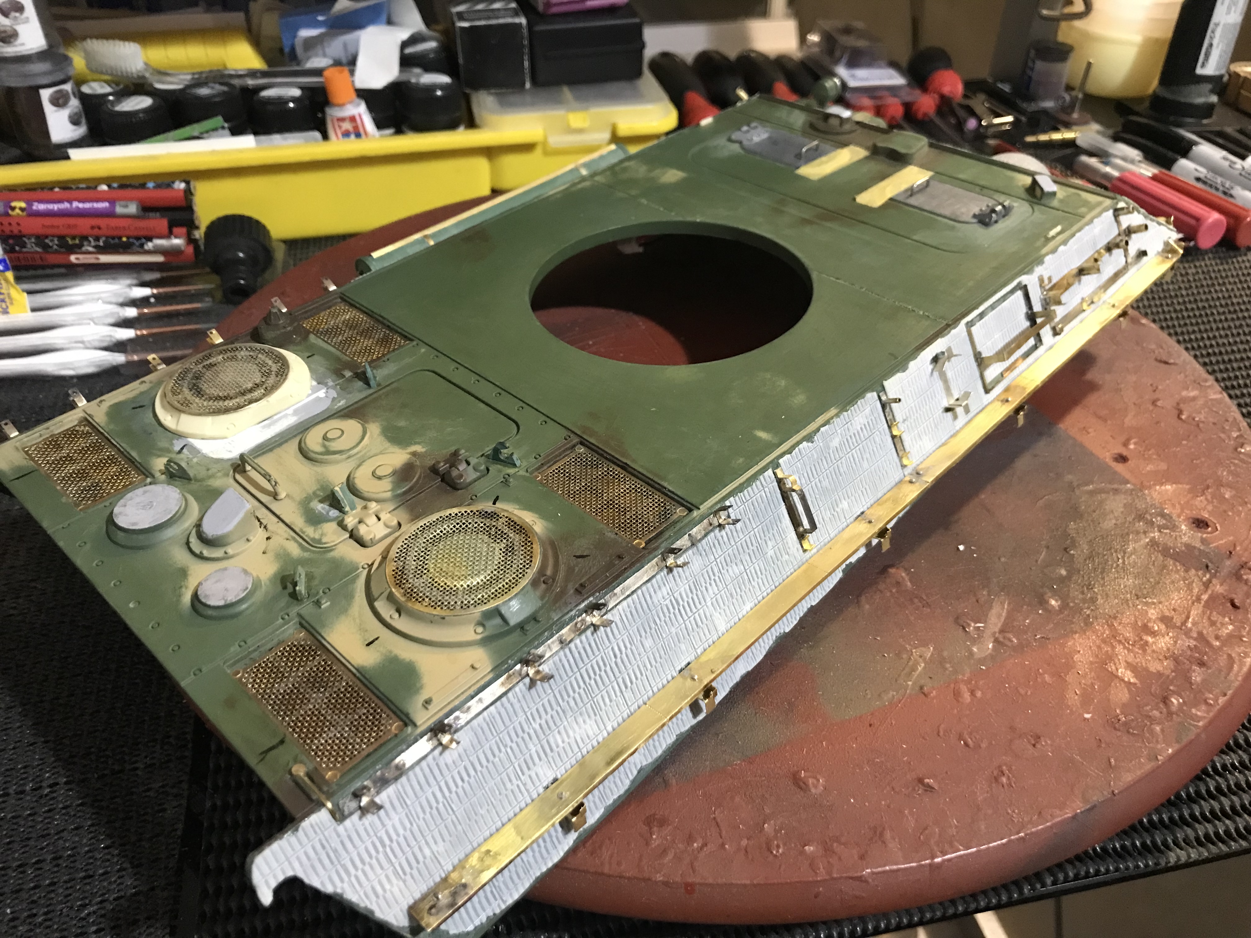 The turret is getting the last bits that are solid enough to cope with rough assembly handling which should mean primer, and the hull rear plate is just deciding how to secure the jerry cans to the stowage panniers before it gets primer.