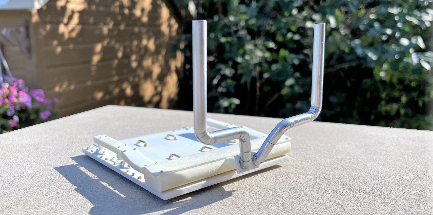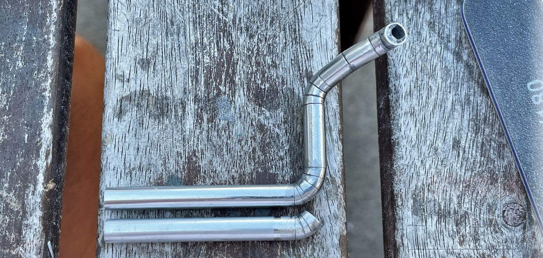 The stacks are created telescopically. Parts are cut and superglued. Angles are made with a nail file. Then the pipes are filed to smoothen the curves. Superglue mixed with aluminum dust is then used as filler, filed and polished. When an issue is found with a specific joint, such as wrong dimension or angle, it can be broken with a blade, reworked and re-glued. Each stack has a total of 14 sections.