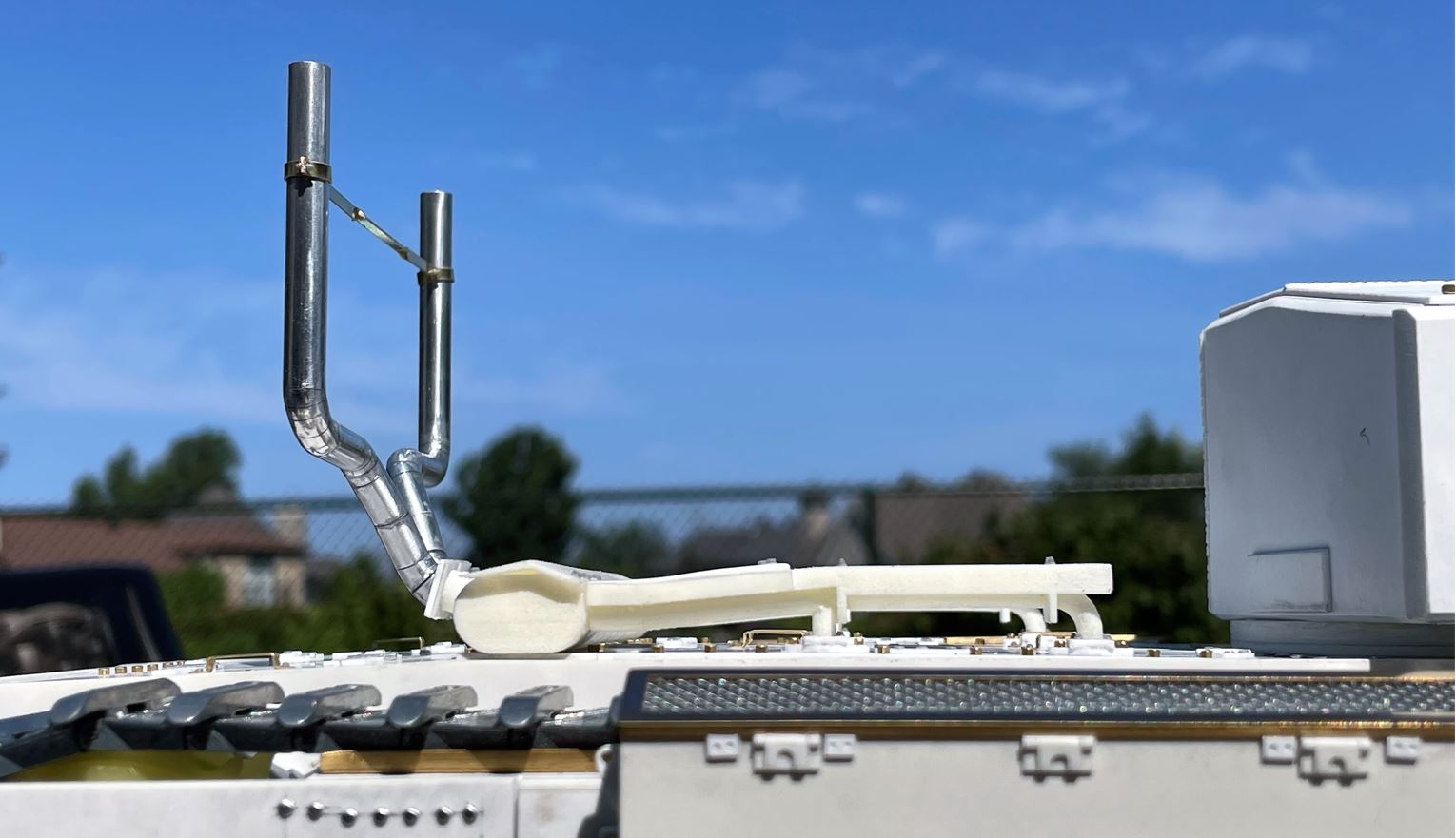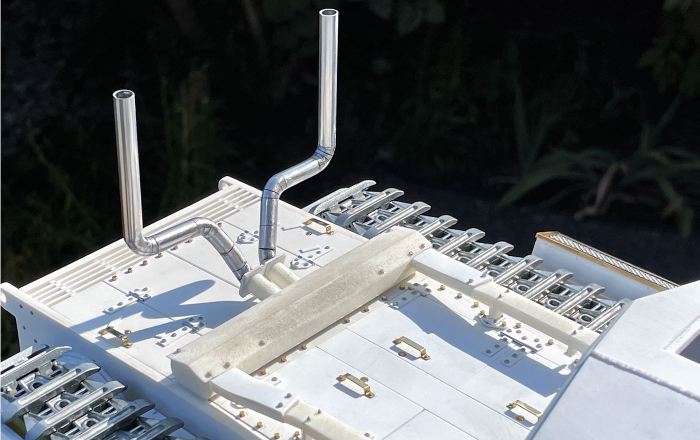 Installing the stacks on the exhaust. Looking ok but as i used the AFV Club 1/35 model as reference, any issue with them were reproduced here, such as the missing slope that i will have to repro on the next accuracy exercise.
