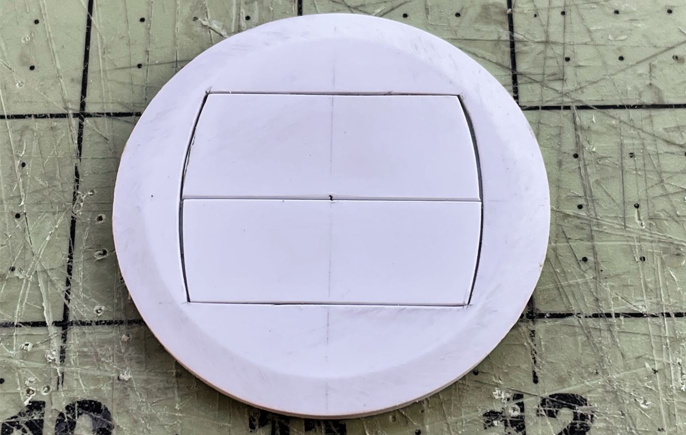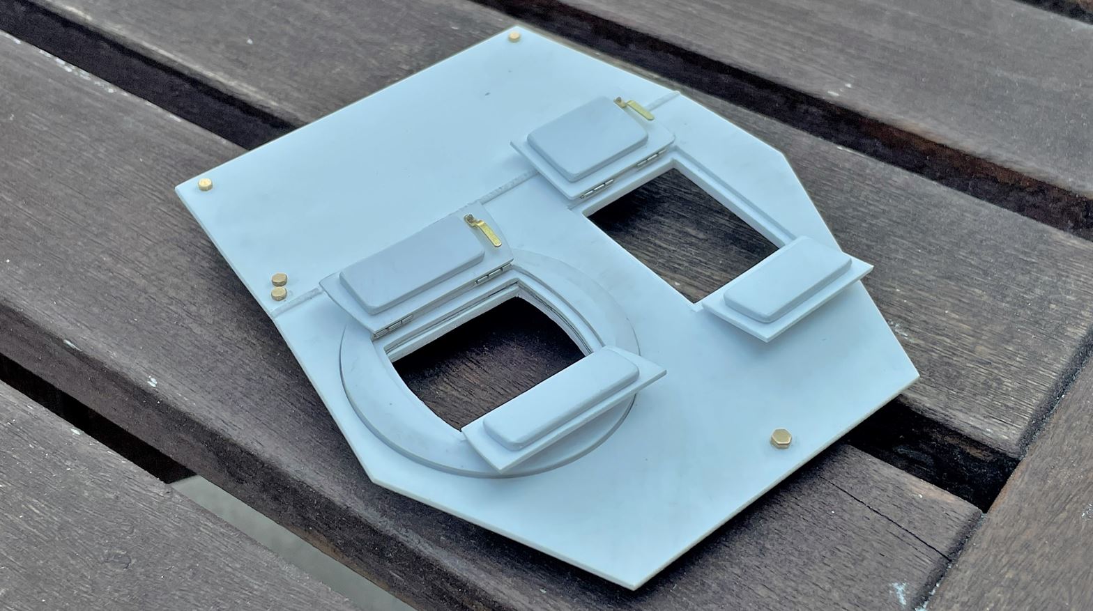 The cupola is made to rotate. It is composed of 2 roundels, a base of 2mm thick and an overlay of 1mm for the top with the embedded hatches. All shapes and dimensions are taken from the 1/35 kit.
