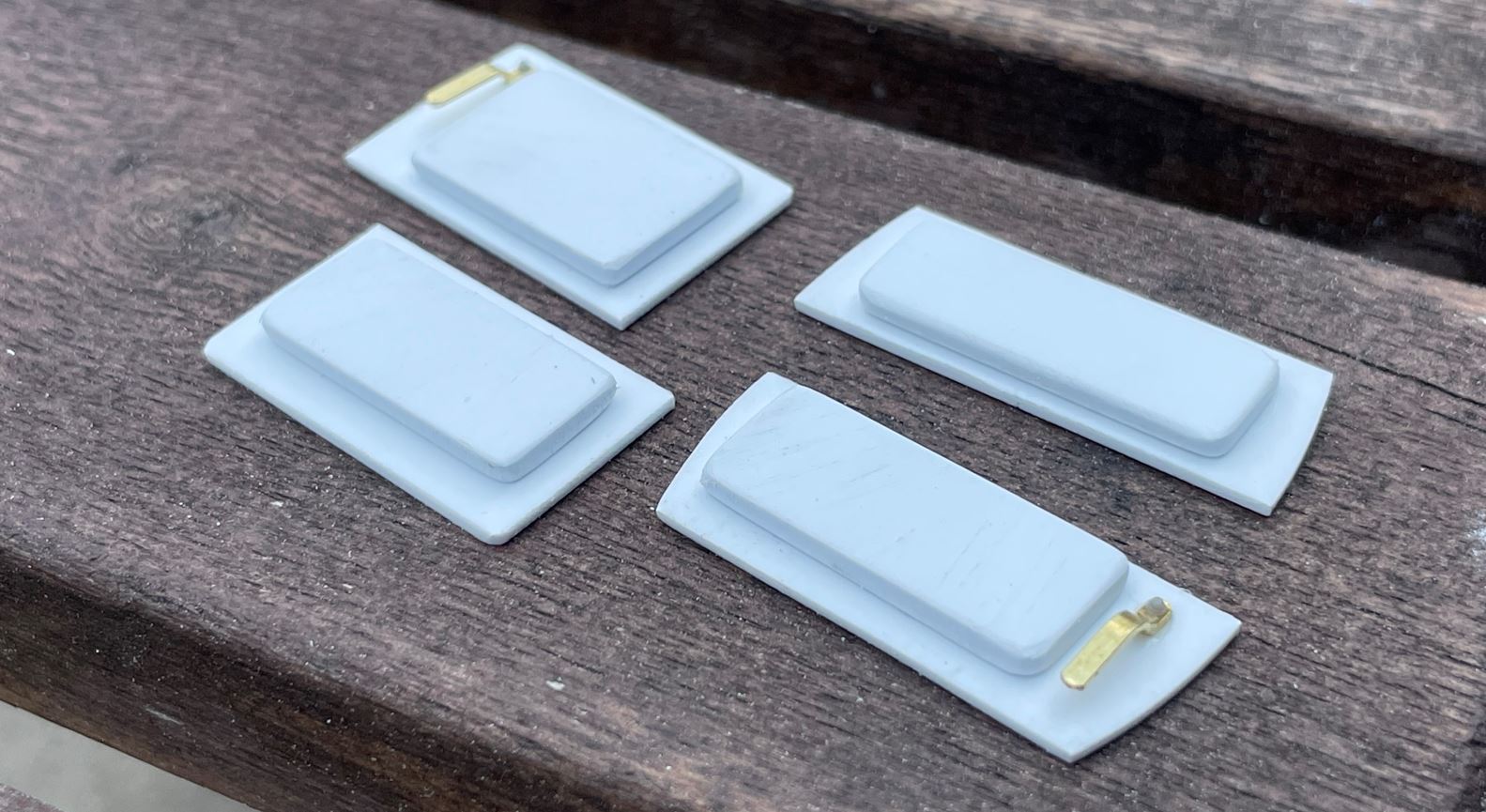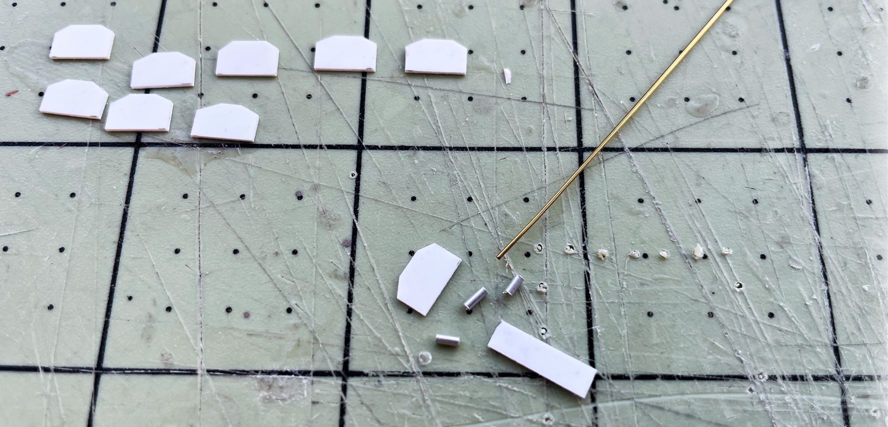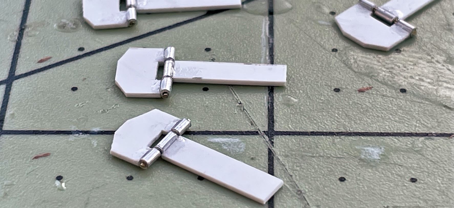 For the cupola and the gunner's hatch, i need 8 working hinges of a specific design. Scratch built like everything. The body of the hinges is made of 0.5mm plasticard, with 1mm aluminum tube and 0.5mm brass rod.