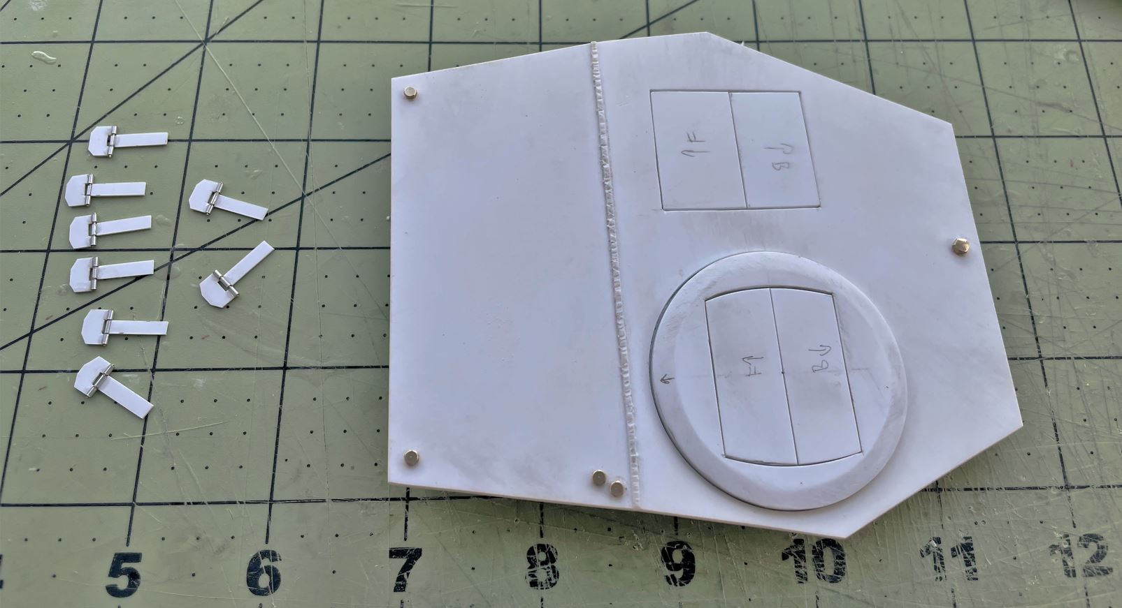 The back armor of the turret has a rounded bolted access plate. Position for the bolts needs to be carefully drawn.