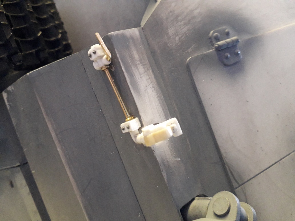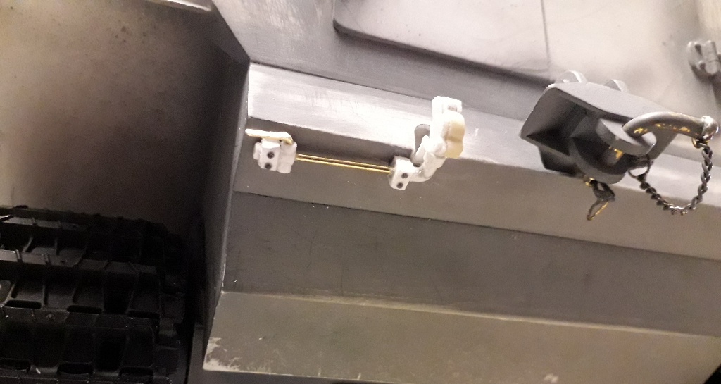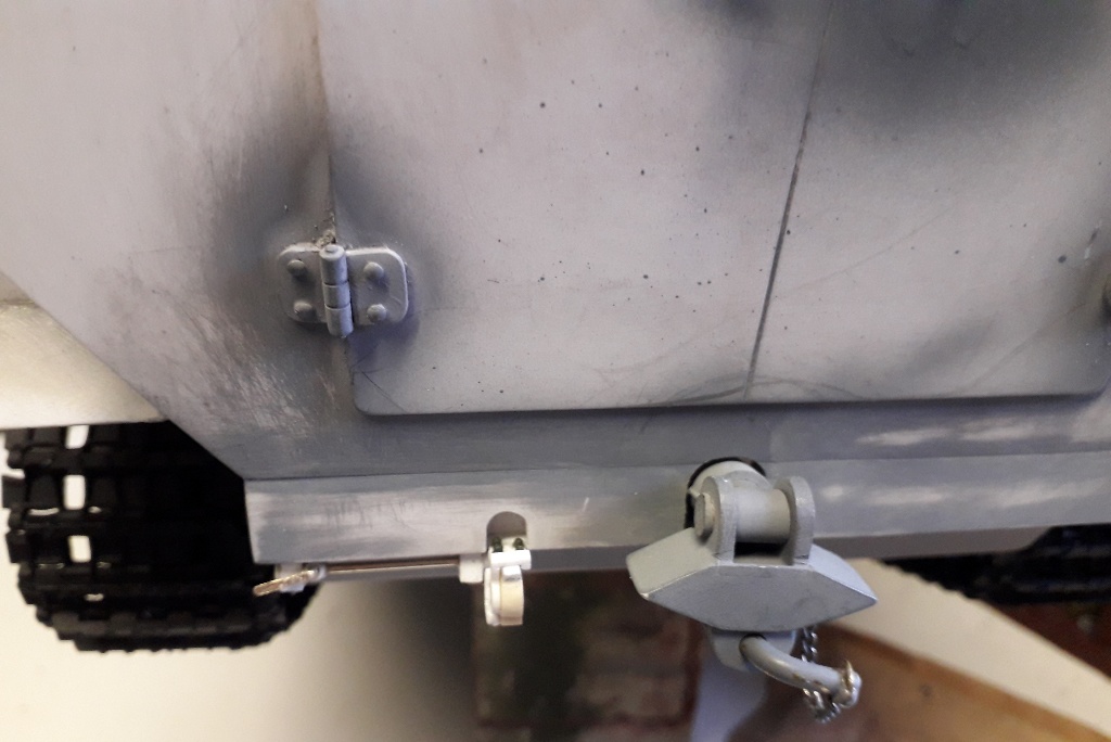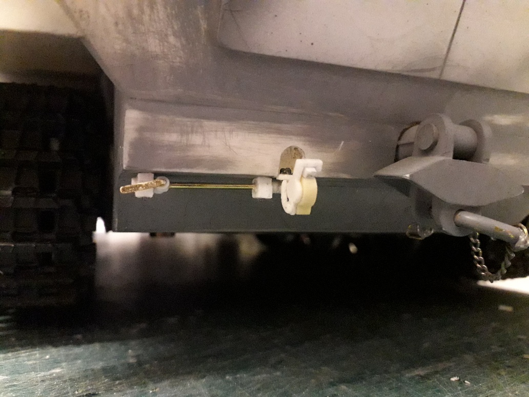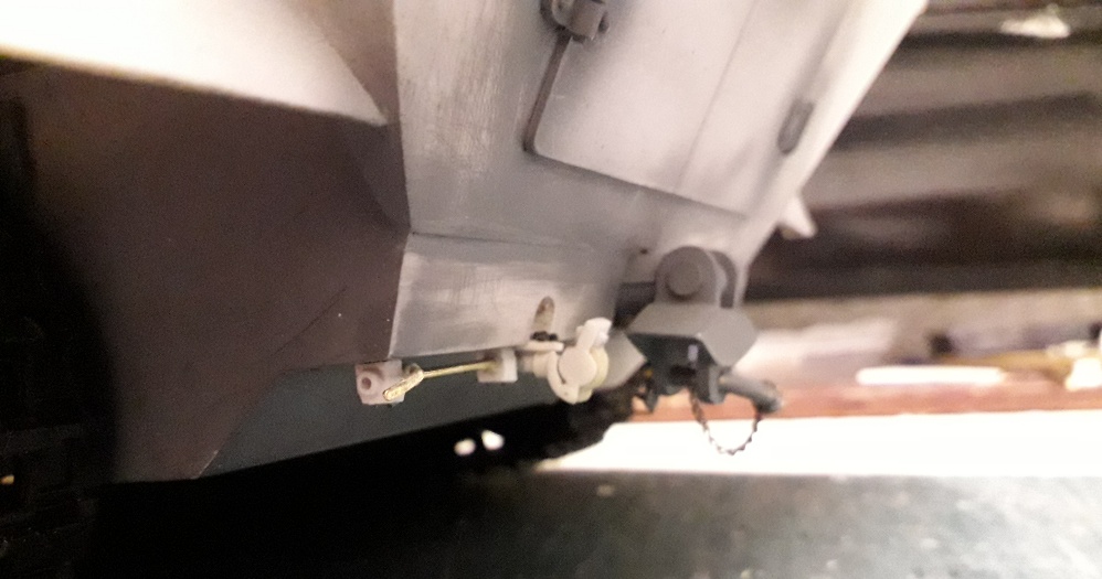 Pneumatic brake linkage now with mounting points and clasps and bolt heads fitted to rear and underside of the hull.