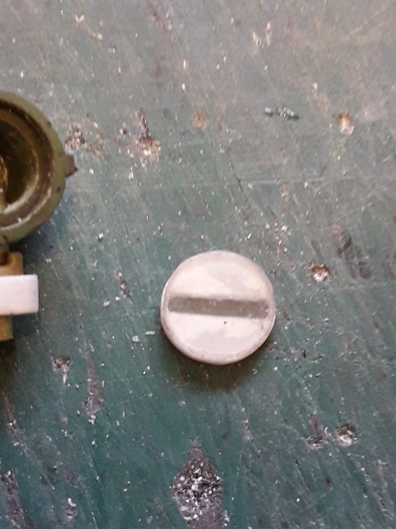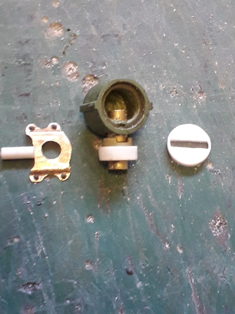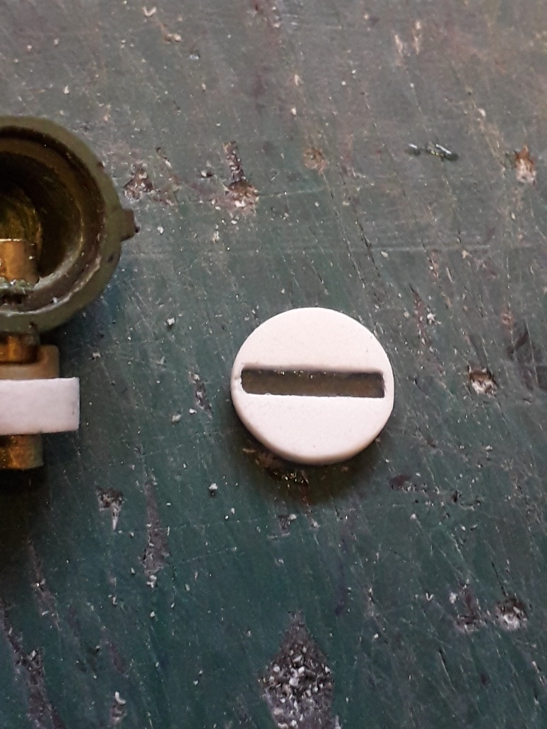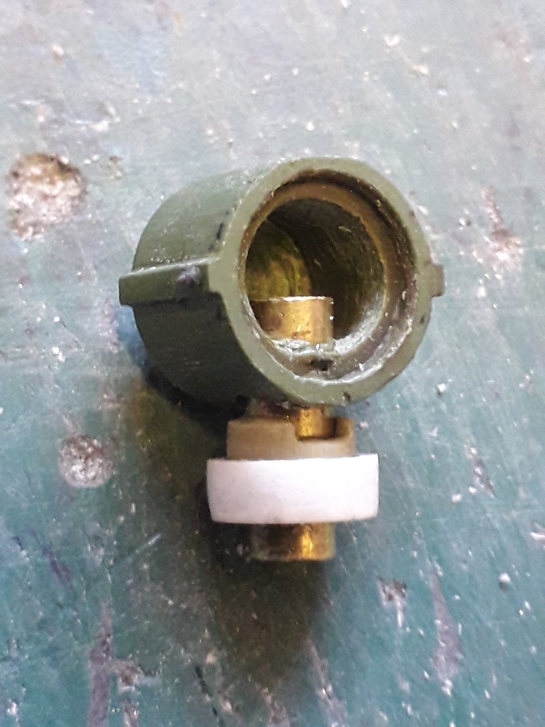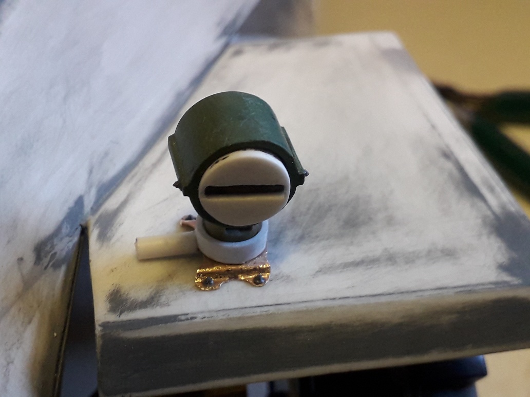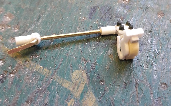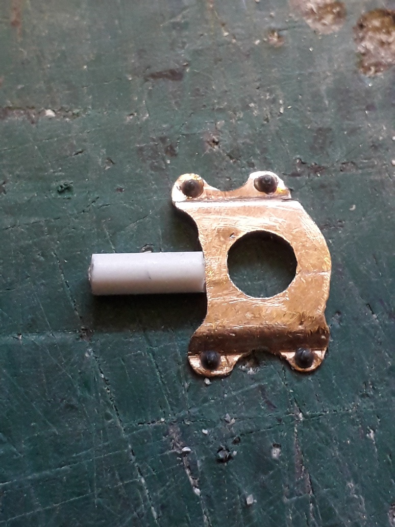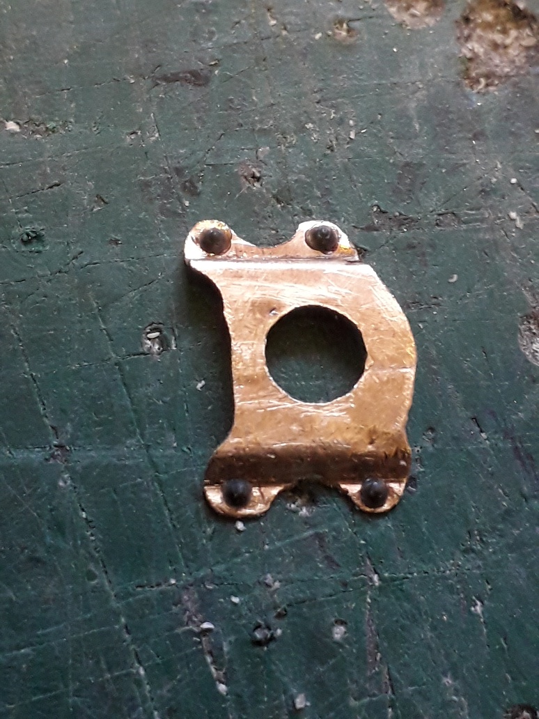 Made from plastic tube, brass and a copper base mounting bracket, bent and filed to shape with bolt heads added, will be fitted with a 2mm white LED for illumination.