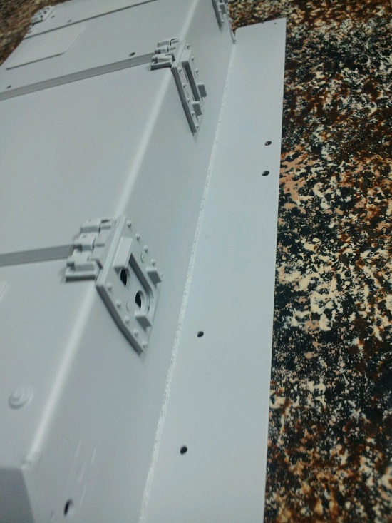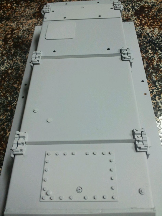 I have been finishing up small items and some large. Here is the pictures of the primed hull and the details for the rear. I also added the side bolts that would hold the transmission to the hull, the tow hooks, the mount for the British tow hitch, the welded door stops, bolts, handles, not to mention the sponson welds. Enjoy.