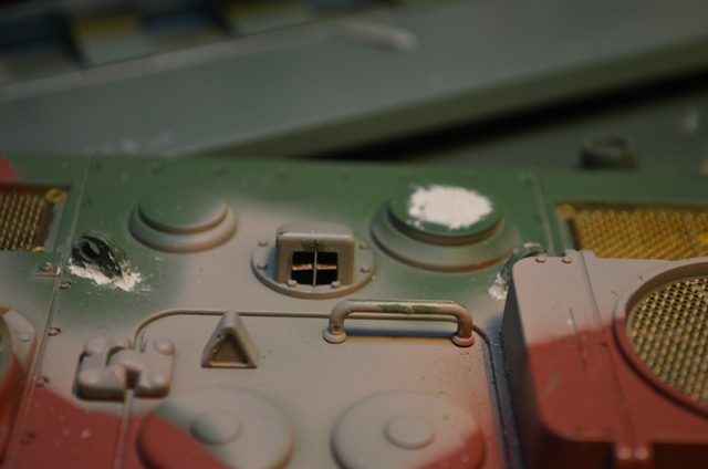 Now for the upper hull. When I disassembled the Panther I noticed some of the plastic storks or studs where the hull screws, screw into were damaged. So I reinforced them by attaching a brass collar around them glued with super glue. That seems to have done the trick.