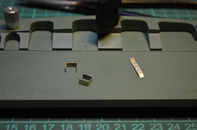 viewtopic.php?f=22&t=8956) I thought of making my own spare track holders. I cut the plastic track that comes with the tank, giving me 6 pieces of track. Then I filled the holes for the track on the side of the upper hull with filler and rubbed them down. Using the metal from a fish tin and a pair of sheet metal cutters. All you need to do is mark a straight line and cut along it. The cutters I have produce a thin strip of metal.