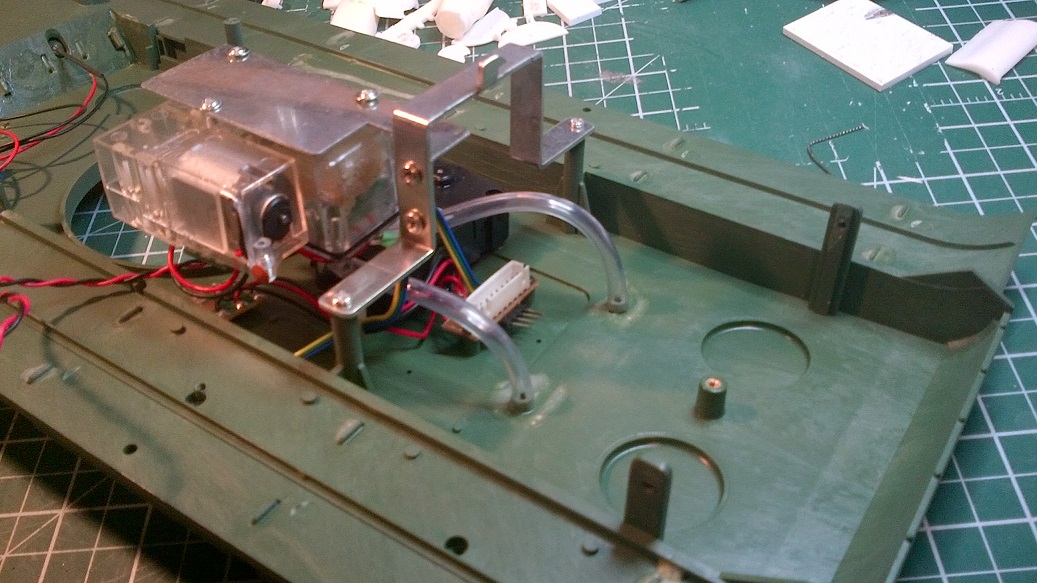 It is basically a direct copy (crappy one at that) of the mount as illustrated on the Clark website. The turret is very cramp and I have to use a mini servo and be very aware of the spacing to make it work. One of the reason I have not decided on elevation options yet is that there might not be room at all and even if I do managed the range of elevation might be so small that it is not worth the effort. TBD.
