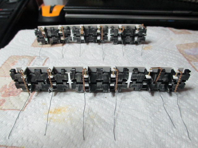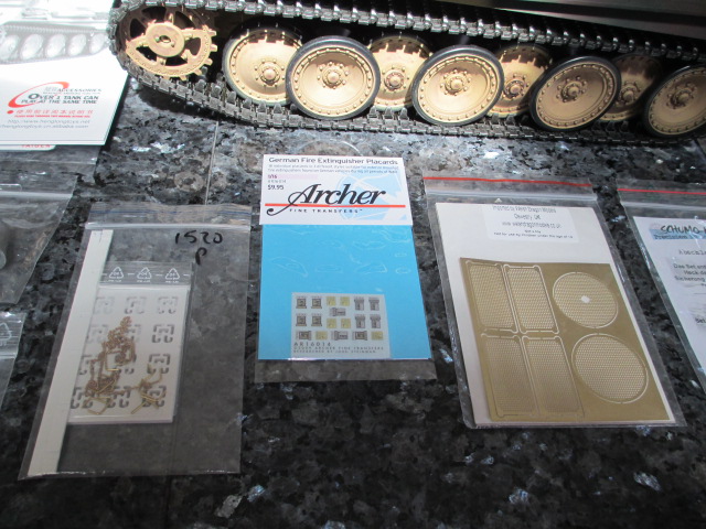 2nd Day work involved adding a spare track link to each side of the tracks as they were much too tight on the tank as delivered. Taigen thoughtfully added spare track links and pins so that work was accomplished fairly easily. Then I decided to begin work on the parts I dreaded most, the Spare Track Hangers. The kit from Tank Modelbau is complete but I say in all honesty, some assembly is required. My eyes were burning by the time I had cut out all the plastic 'c' clamps and cleaned up and glued them to the strip rack. I didn't have any metal spare track links for this but with a little clipping of the mounting posts, cutting them apart and sanding the resultant edges and nubs, the strip ones that came with the tank to be flush mounted on the rear deck worked fine. Tomorrow night, I will do the really small stuff, cutting the 11 3/4 inch micro chain into twelve lengths to be glued to the tiny brass hooks and said assemblages inserted and glued into tiny slots on the track racks The yankee drill will come in handy again drilling out the small holes for the hooks to rest in as well as possibly drill three countersunk holes per side to use as screw mounts for the completed tracks and racks. I don't trust the glue, excellent as it is, to not shear and lose one of these marvels of tiny modeling somewhere in rough country. This will be fun.