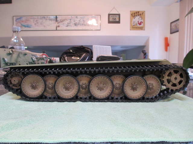 Looking good, I have the same tank with metal tracks which sits to low so I've ordered a set of stronger springs. The same thing happened to my Jagdpanther but that time I just drilled a hole a bit further round for the spring end to sit in which did the trick.