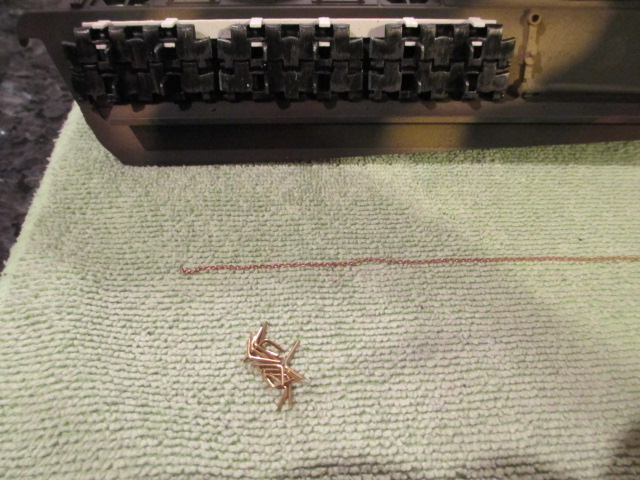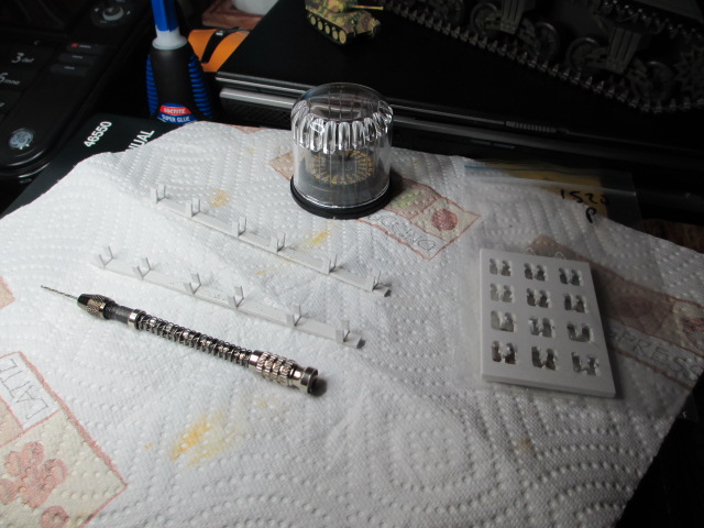 Thank you for the encouragement. Tonight's work will require the use of the magnifying Tensor Lamp at my desk. *chuckles* I will need to run to the Hobby Shop this afternoon to get some smaller drill bits for the Yankee drill. That micro chain is ...micro... I need some new flat dunkelgelb and braunviolet for these accessories as well. I want to keep the existing paint as intact as possible so no over spray of flat lacquer on this tank. I'm not even sure what this airgunned paint is? Acrylic, possibly. It has a rough, sandy feel to it and adheres well to the plastics but not so much the metals.