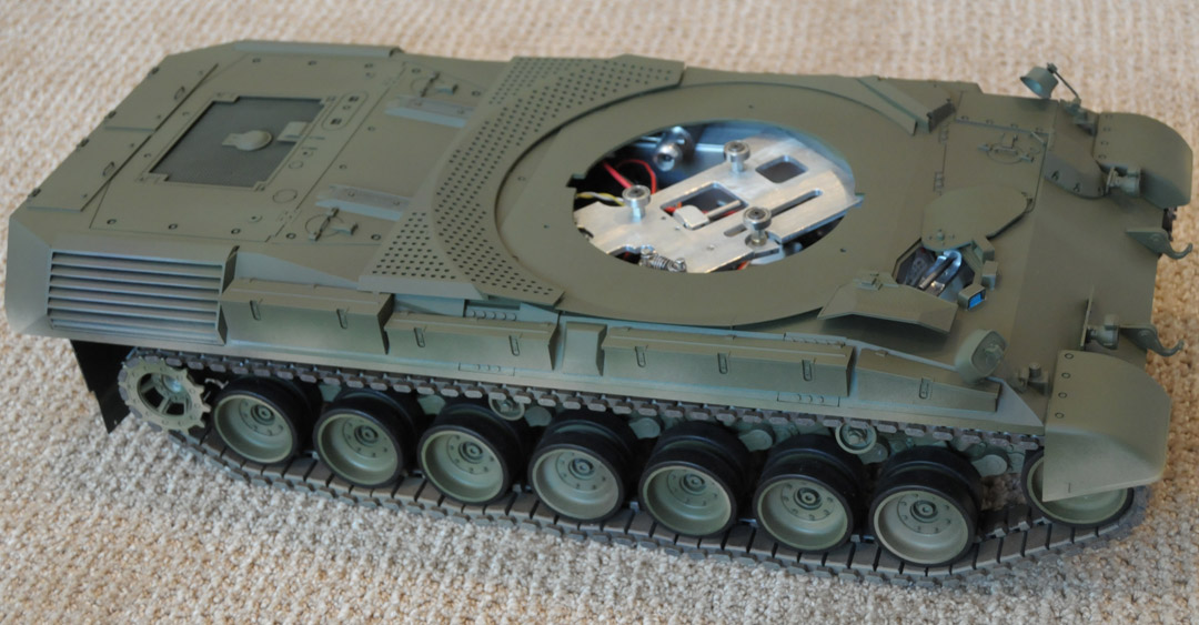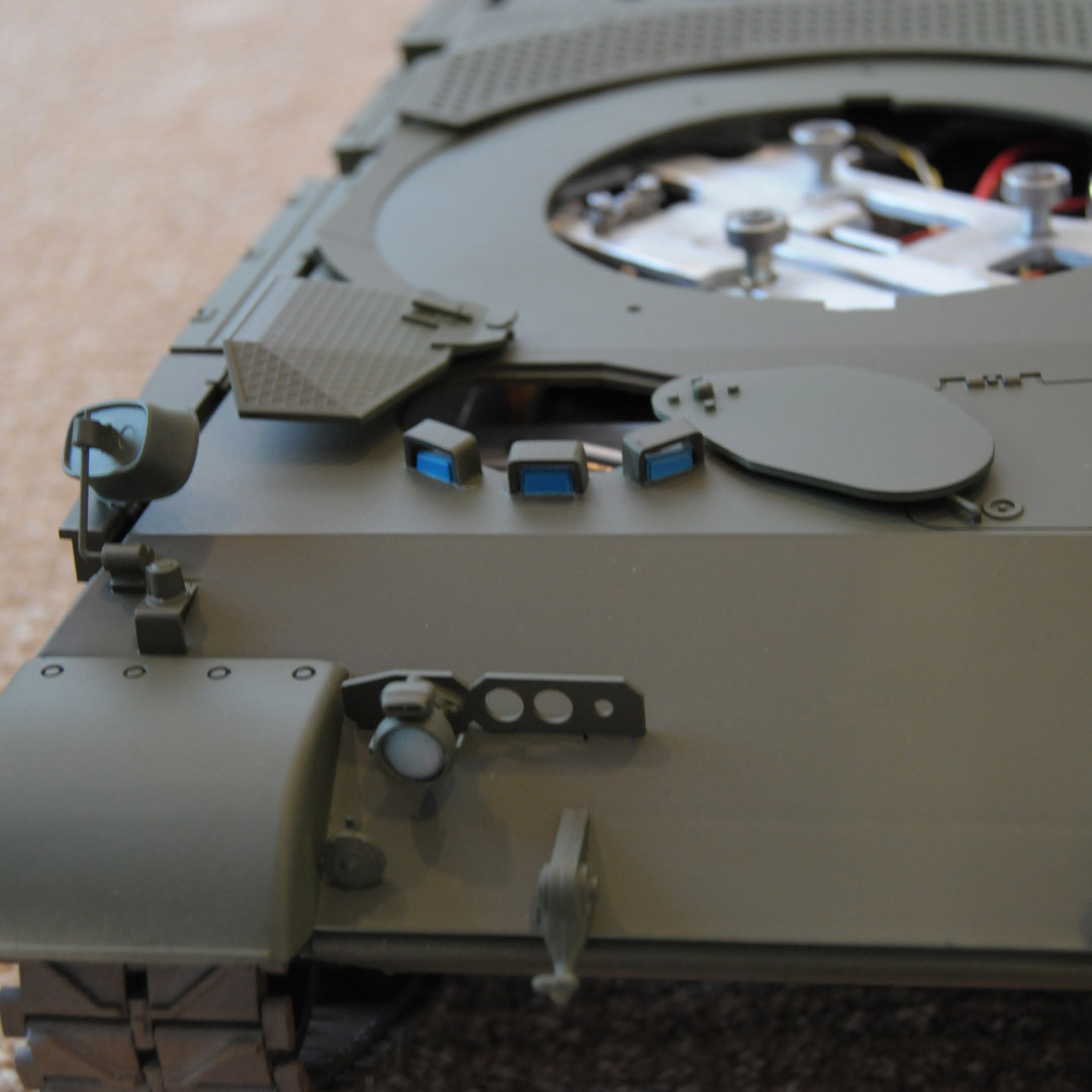 Engineered, designed and fabricated parts by Daryl Turner. The model uses a one off custom metal top hull service lift designed by Daryl Turner; cannons "servo" raise and depress; front range radar operates 360 degrees; rear radar spins, raises & retracts; gear reduction makes for controllable driving; and turret sits on a Turner designed turret quick release unit using 3 large bearings enabling fast turret rotation spins emulating the real Gepard's turret.
