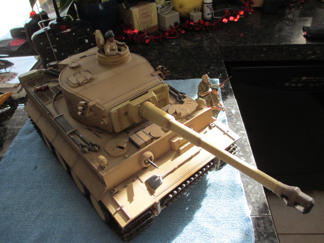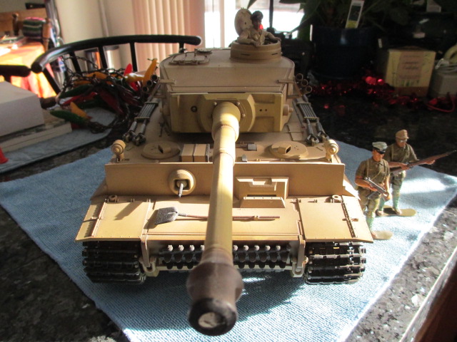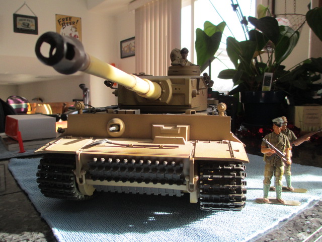 I was talking with Pale Painter earlier this morning and he mentioned that he has a new Asiatam\Taigen lower hull and spare Tiger 1 parts that he is going to build an early Afika Corps Tiger 1 out of. I think that is a really cool idea because I personally love the older, early Tiger 1's. To me, they personify 'Tiger tank'. That commo got me to thinking. I have several older Heng Long tanks with old style boards and bits. With all of the amazing things coming out for tanks in the hobby, it makes a lot of sense to upgrade existing ones _as long as enough of the original tank remains_ to call it the same vehicle. *chuckles* With that in mind, I'll start a thread for these old veterans. Beginning with one that was the the chief jewel in my collection once. This Tiger 1 model 131 has the RX13 board in it and the airgun has been replaced by one of John's maddog aluminum barrel 'specials' that give it a pretty good velocity. It runs perfectly as is but would be an excellent candidate for my own Tiger 1 upgrade. She is complete with 1/18 scale Infantry support from 21st Century action figures. These are like the Tiger, sourced from a few years ago. Now if only Taigen hadn't brought out their 'Three in One' RC Kit where you can build an early, middle or late all metal RC Tiger 1. I am really jones-ing for one of those. Decisions, Decisions...Pics: