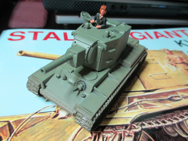 Next up: A 1/72 scale Unimax model I built last week and considered several paint schemes before going with the basic Soviet pea green with mud weathering. I painted, detailed and weathered this small version of the giant KV-2A in a marathon seven hour session yesterday (Sunday) The primer is Tamiya's excellent grey and the spray color was Testor's Bomber Green flat. This was as close as I could come to color images of this vehicle with it's standard paint applied. Normal shadowing was performed while the tank was in primer then a pin wash of 50\50 flat black and brush cleaner was applied after the initial spray. The tracks were brush painted in steel then this was followed up by weathering with mud from Tamiya's weathering kit. The figure was painted in Testors tan flesh with Tamiya acrylic Dk Green for the coveralls and Testor's flat khaki for the uniform shirt. A leather belt w\silver buckle and two tone ( Testors flat brown and leather ) tankers helmet completed the figure. The boots were left in molded black.