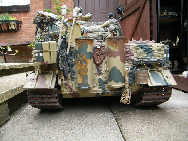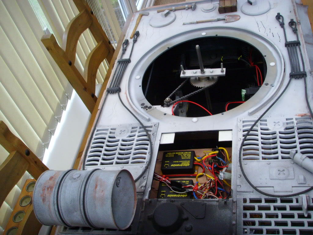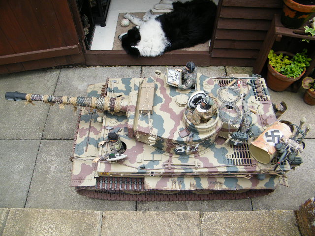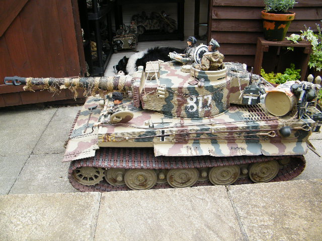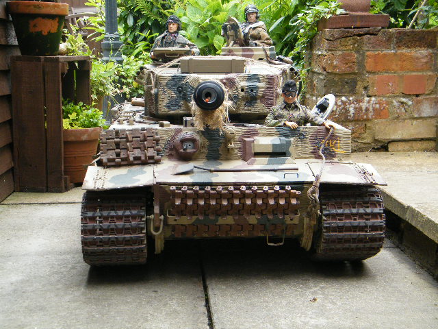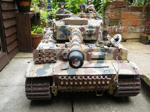 This Field of Armor Tiger was owned by a good friend of mine,but he had to sell it, when his pension fund went..t**s up ..it is as you can see a late production model,..it was built to a very good standard,and had 2 x 350 w motors fitted,with the final drive by chain,the motors came from a mobility scooter,it had 2 x 40amp Electronize speed controllers,and a Tamiya Full option sound system,..it also had many metal accessories, which included a metal cupola, loaders hatch, tools,side skirts,...now for you sharp eyed eagles...can you spot the mistakes on this model....one being by the makers..i.e. Field of Armor, and the other..by .whoever bult it...