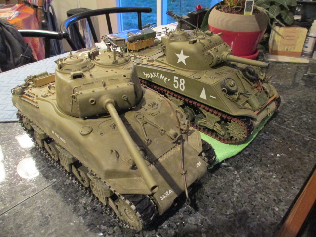 Now that's a great shot Painless.... it really highlights the weathering you didPainlessWolf wrote:I'll keep that in mind, Alpha. ;o) I'll have Mike give me a demo while he is here. ;o) I had errands to run after work today so all I did upon coming home was get out the charger to give both of the Shermans a full charge to show off with this weekend. A quick picture to show both side by side.