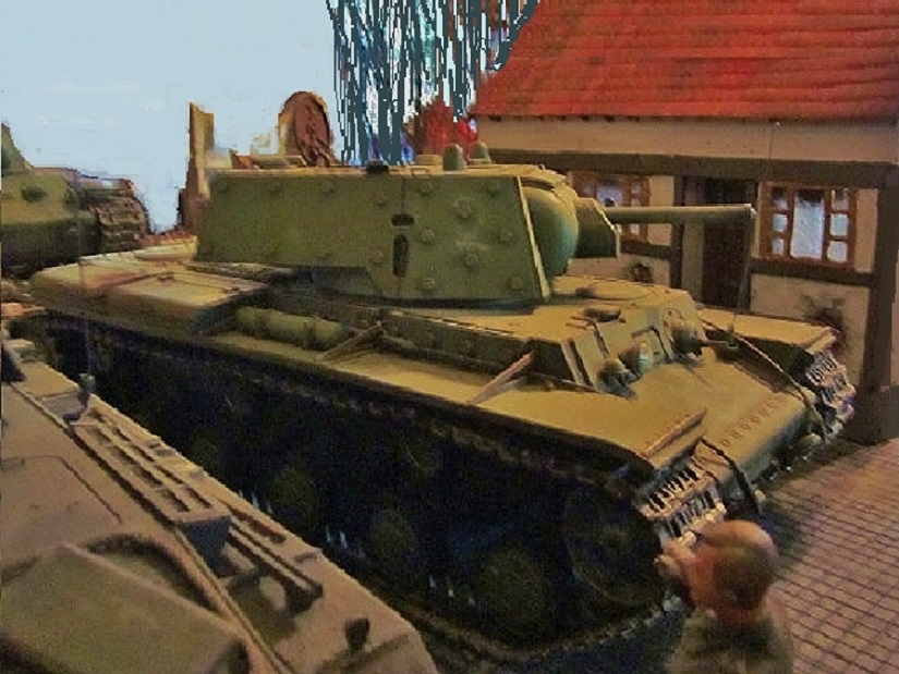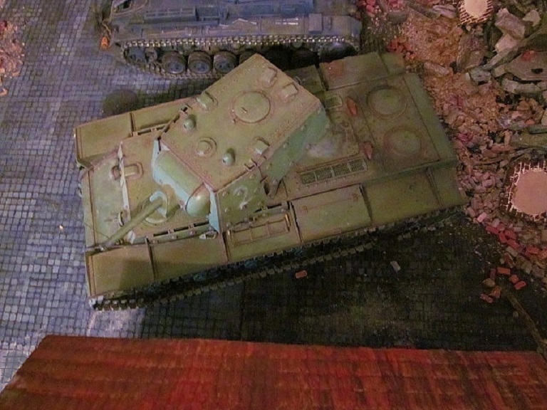 Glad you all liked it. It was the most complicated one I've put together. Alpha, The KV1E is on the cobblestones I made using that sheet of tub surround plastic. The stuff is hard to work, very tuff styrene, but if you want to make a road that slopes up and down it works great as it is flexible. I glued mine down flat though to match the height of my other modules. It is also slippery so a steep slope would be hard if not impossible to run a tank up unless it had real soft rubber tread inserts. I'll post a picture of that module somewhere and describe how I made it.