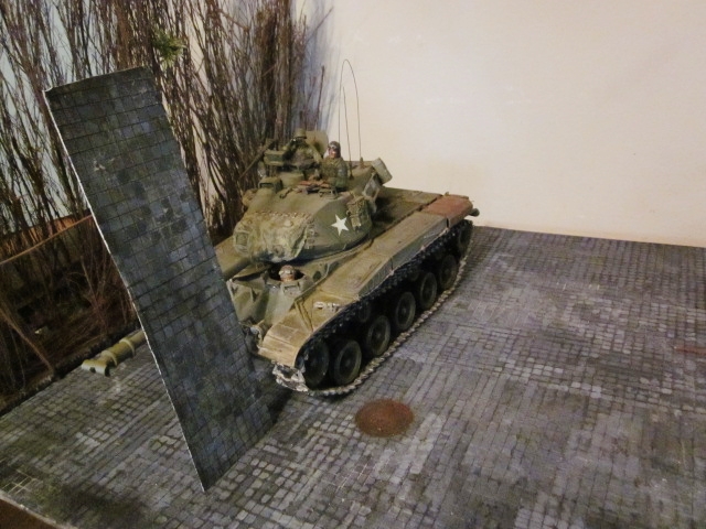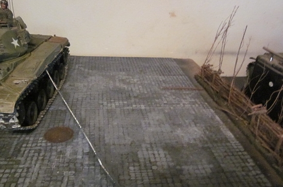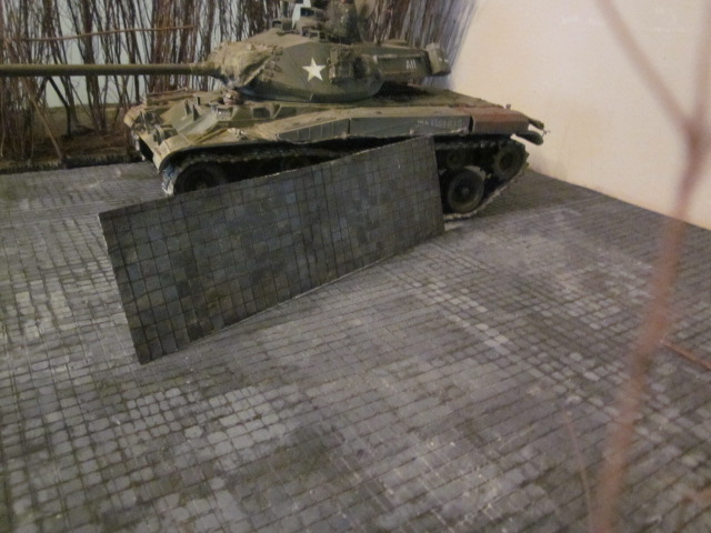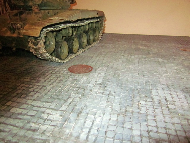 This was made using a flat piece of styrene that comes in a bathtub surround repair or remodeling kit. These kits usually have 3 large squares of flat very tough styrene in them and can be scored to represent the joints between cobblestones. Fancy cobblestone patterns would be hard to do. After scoring the joint lines paint the whole sheet with a black hobby paint that regular paint thinner for enamels will not remove. Then start painting all the little squares to represent the individual cobbles