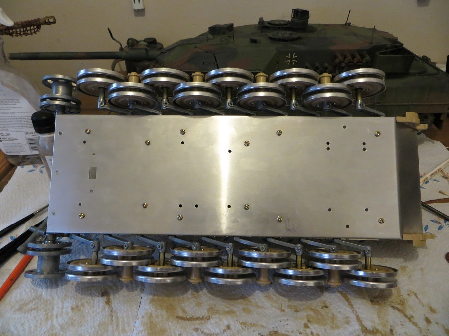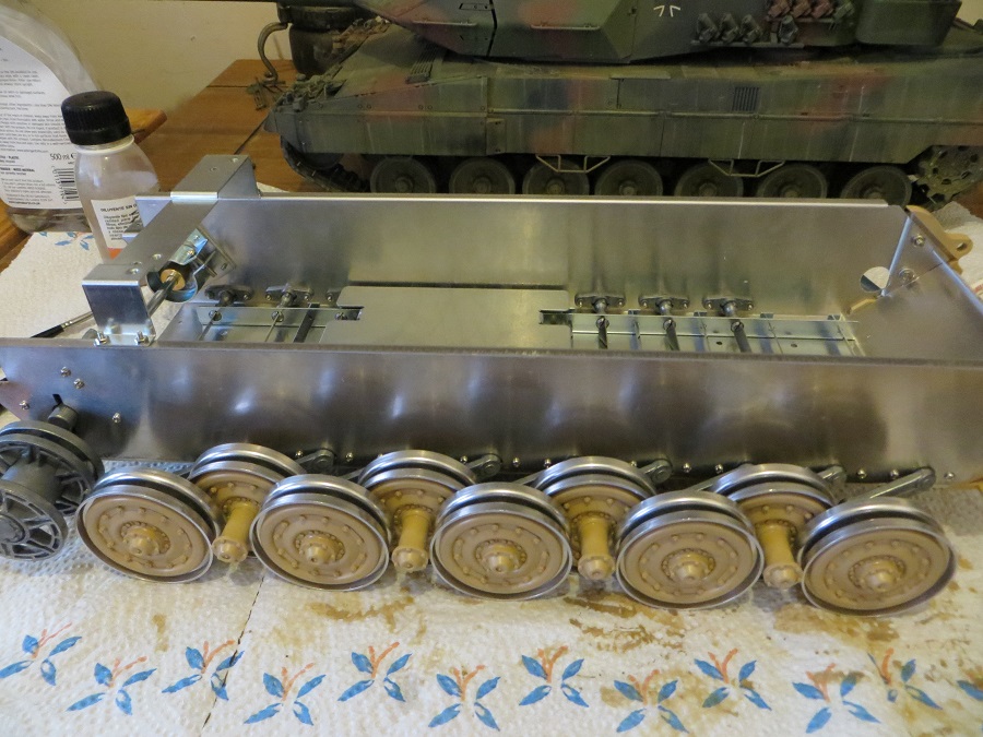 So first there are no holes for the sponsons and there is a metal brace which the top sits on. Normally there would be a speaker there with an attachment for the top to screw onto. The idler drums will also go and get replaced by shumo drums. The mounts themselves are fine. More holes in the bottom than the FO kit and a switch opening too by the looks of it. The wheels also have allot of play in them. The screws also appear too be of a different material to the ones on the FO, but I'll replace them all with hex bolts anyway I should probably finish my Leopard first.