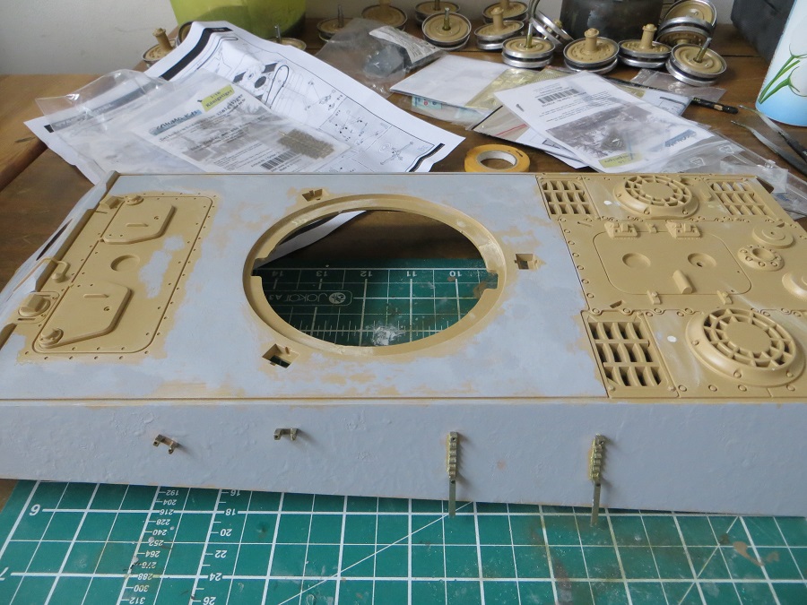 While I wait for things to be delivered from Japan, I figured I'd start filling holes and use some Mr Surface 500 to create a rolled steel plate effect. I've build up a few layers, sanded them back a little then added another layer. The pic below shows it waiting for another sand back. Eventually it should give a fine undulated, pitted surface as though its been through a rolled press several times.