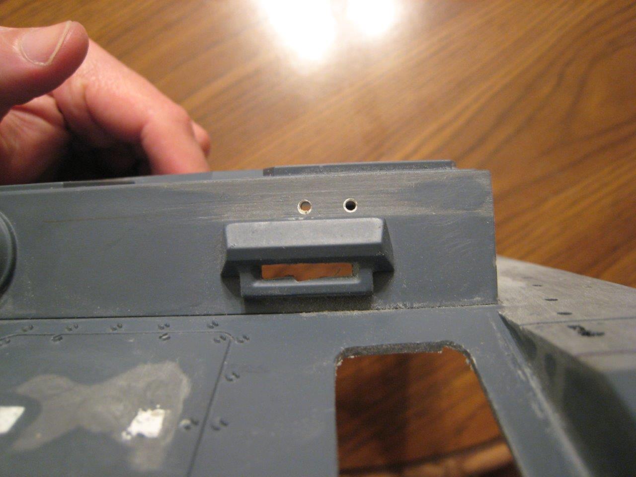 The coaxial machine gun also had to go. It was in the wrong spot and the plastic thingy looks awful. So, I cut that off and drilled a hold for a metal coax that will eventually use a small fiber optic line and an LED to provide a flashing coax. It’s also more accurately positioned. I eyeballed this one, too; but, it seems pretty accurate.