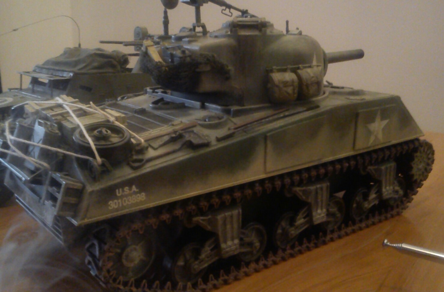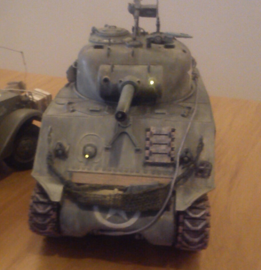 Now that is one sharp Sherman! ;o) I love the lived in look with all of the stowage and the frame welded to the turret side for packs. A beautifully built tank.