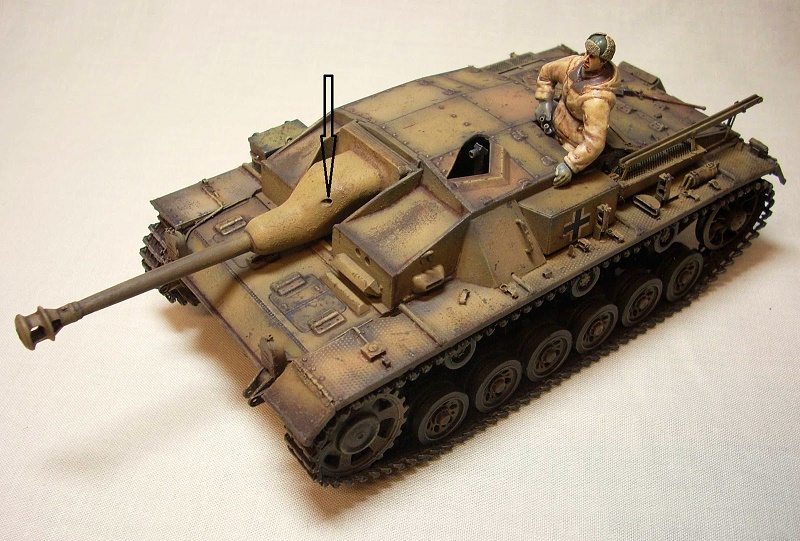 "Later G versions from November 1943, were fitted with the Topfblende pot mantlet (often called Saukopf "Pig's head") gun mantlet without coaxial mount. This cast mantlet with organic shape was more effective at deflecting shots than the original boxy mantlet armour of varying thickness between 45 mm and 50 mm. Lack of large castings meant that the trapezoid-shape mantlet was also produced until the very end. A coaxial machine gun was added first to boxy mantlets from June 1944, and then to cast Topfblende from October 1944, in the middle of "Topfblende" mantlet production. With an addition of a coaxial, all StuGs carried two MG 34 machine guns from fall of 1944. Some previously completed StuGs with boxy mantlet had a coaxial machine gun hole drilled to retrofit a coaxial machine gun, while Topfblende produced from Nov. 1943 - Oct. 1944 without machine gun opening could not be tampered with." - wiki