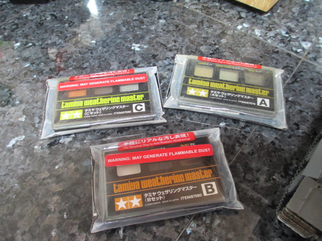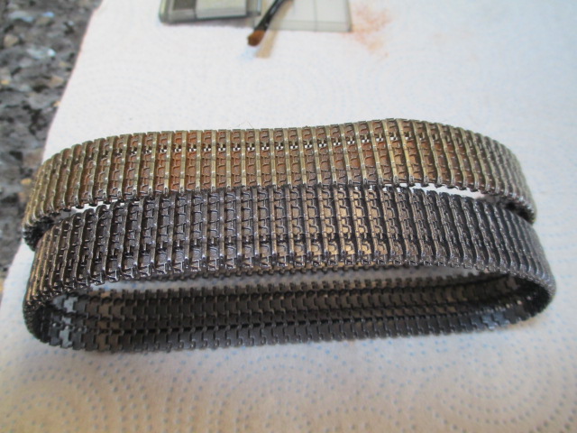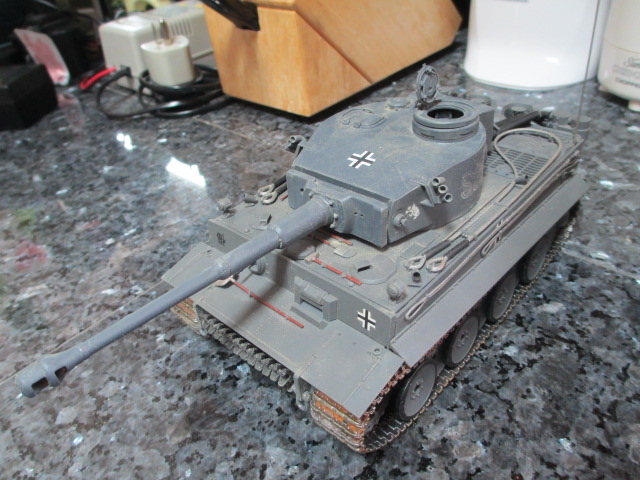 Today was absolutely beautiful, a perfect day to get out the rattle cans and tank parts. Using Tamiya's excellent Gunmetal enamel, I put a couple of light coats on to cover the molded yellow of the tracks. I had no interest in using too much paint. That would have covered the tracks' fine detail and took away from the desired flexibility. After sufficient drying time, out came Tamiya's weathering kits. I used rust then worn metal with a touch of dust to finish the job. I'm very pleased with the results. The old Tiger looks great crawling around on the countertop now. Next bit of fun is too remove the top and clean and regrease the gearboxes. That's a job for another day. Pics: