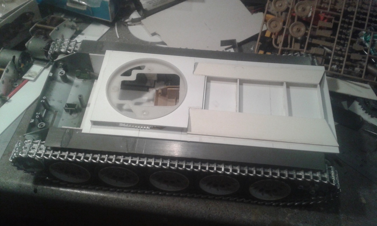 Having glued the chassis back together it was time to start on fabricating the upper hull, this is where the WSN hull is great as the gearboxes fit very nicely low down and don't interfere with the fit (I know some don't like the gearboxes but ive run my metal tracked tiger on them for over three years with no problem. I made the engine deck with a support layer to give it extra strength and this also helped with mounting the motor for the turret ring as its nice and stiff. I love working with plastic card and its fun working out the angles so that it goes together like the real thing