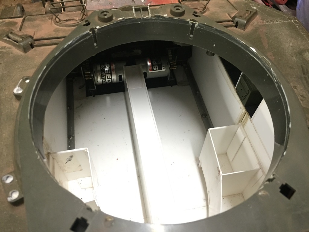 I am now thinking of adding a turret basket as per the original and then add the gear ring to the base of the turret basket wirh the drive motor attached to the floor out of sight and underneath the basket. Not sure if it will work but will try a Heng Long setup initially as i have all the spare bits already.