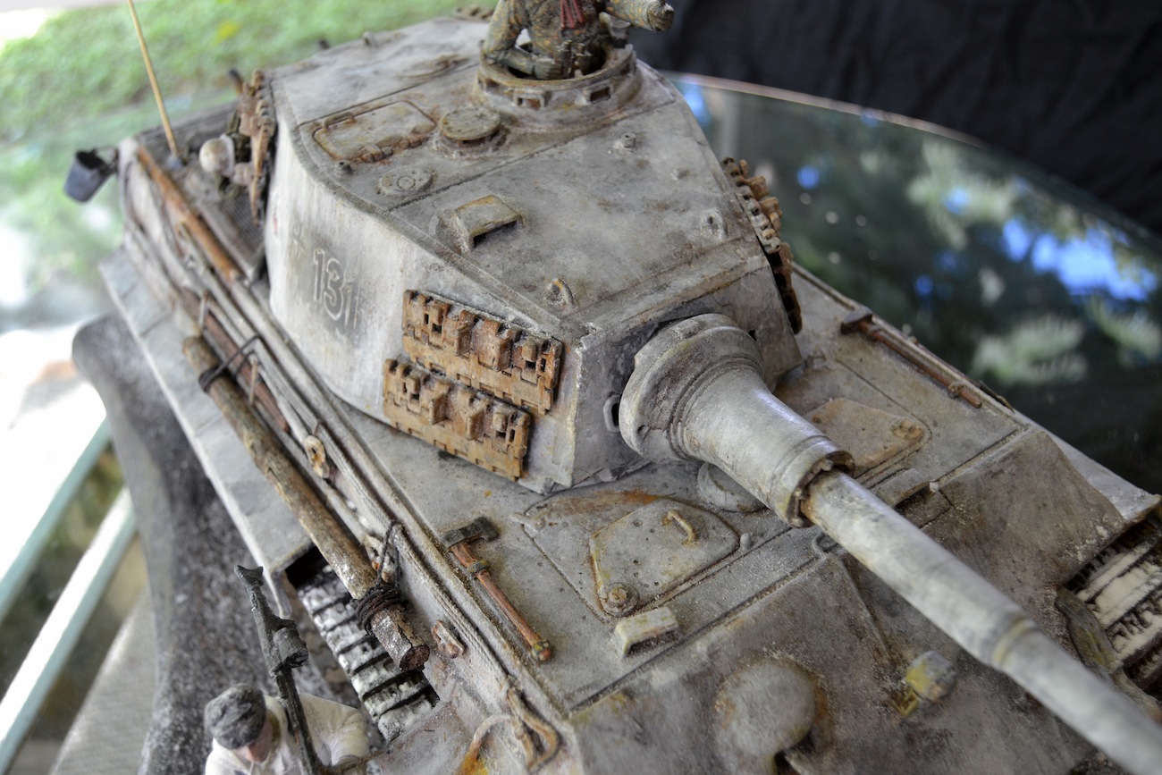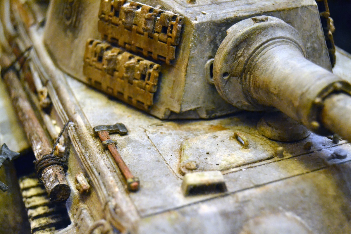 Thanks:) The smooth upper and zim lower was driving me nuts so I used dry wall compound to fill in zimmerit on lower hull, diluted white paint to create a wash. Brushed a light grey to create some camo patterns to go along with what came with it already..then sponged and brushed on the white wash. Used black iron paint very diluted to give some streaks and texture. Used iron paint with rust activator for rust areas.